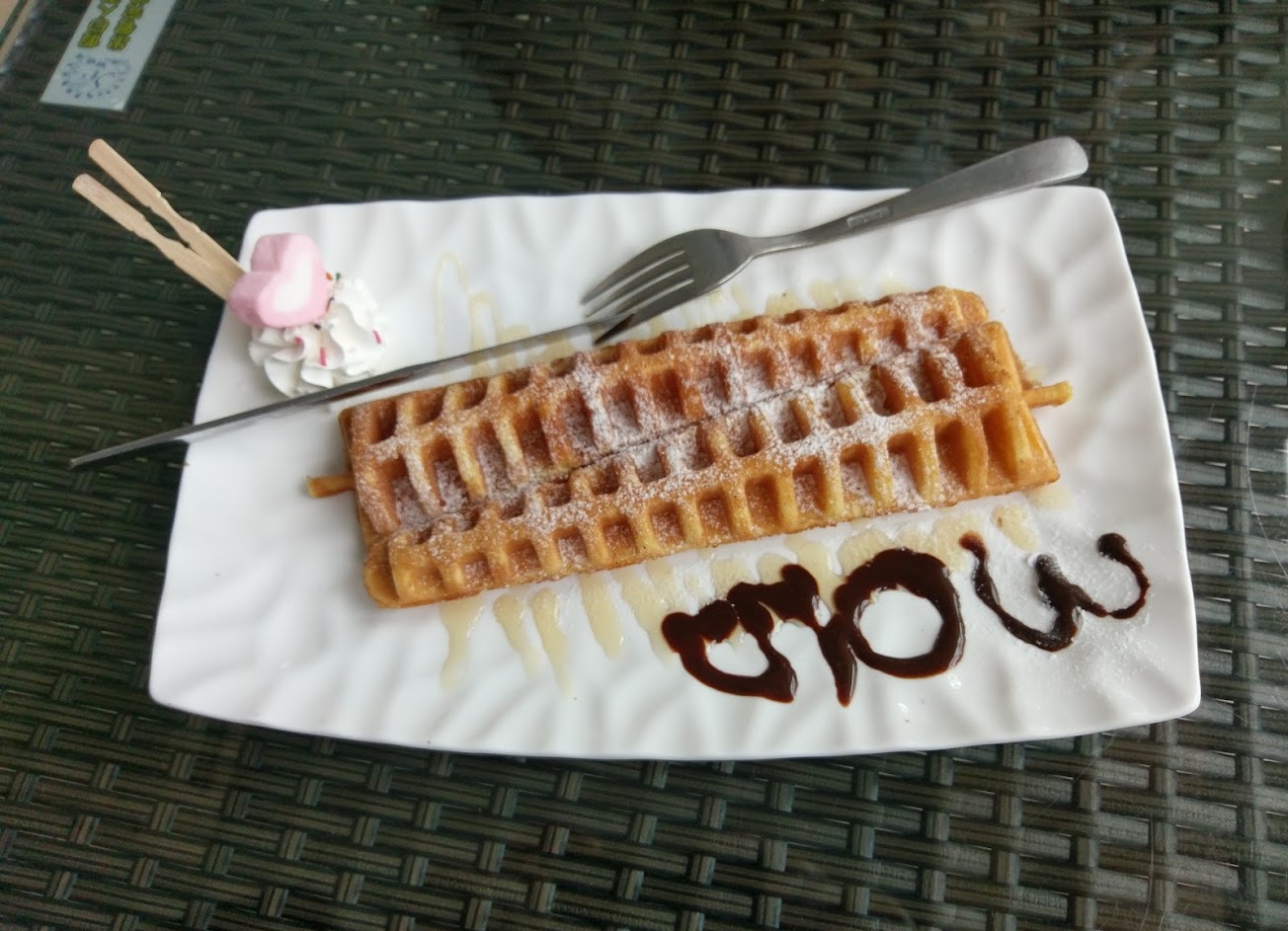鬆餅好吃? 這張圖可以看見送來的餐點 送來時叉子跟刀都在蜂蜜裡面 拿起來整支黏到不行 跟送餐人員反應在幫我們拿一個新的餐具 竟然叫我們自己去拿(口氣非常不好,走掉 全部人的傻眼 服務非常差