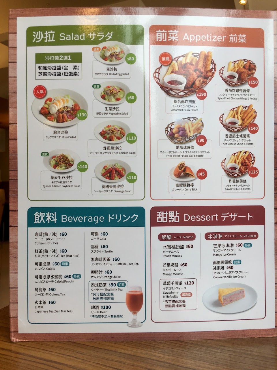 【餐點】主餐本身蠻空虛的,沒有內附配菜(如高麗菜絲) 配菜需另外單點($20-$120都有) 套餐+60為飲料、甜點、沙拉、湯品任選二(且不能重複選擇品項,比如說不能選兩杯飲料) 咖哩的辣度可以自己做選擇。