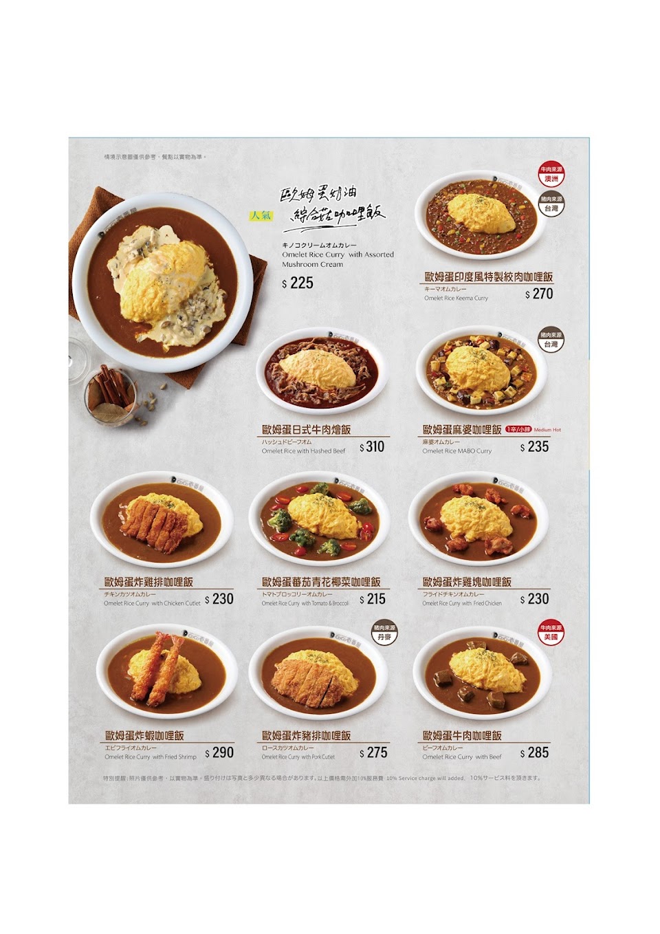 歐姆蛋奶油綜合菇咖哩飯 幾個月前來吃還是200$ 今天一看菜單上居然變成225$ 還沒+10% 單點兩盤飯要五百多 去對面薩利亞都能吃一桌了 晚景淒涼啊coco一番屋