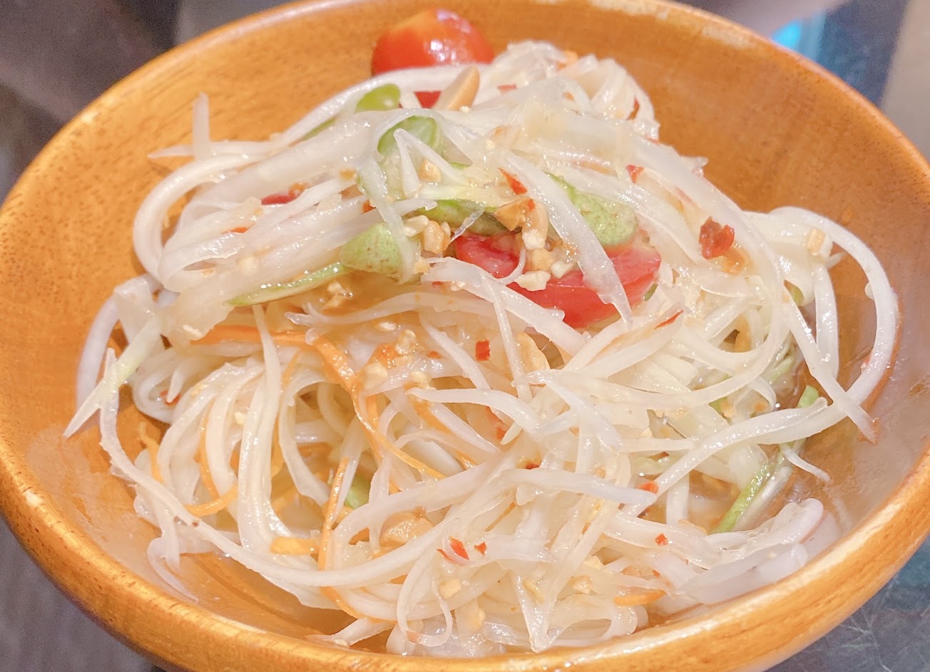 朋友介紹慕名而來,這家泰式料理店位於桃園藝文特區附近,約步行8分鐘左右可到達,不收服務費,無個人低消,餐後付款。店面裝潢以橘黃色調的木質傢俱為主,搭配門口的大盆植物洋溢著南洋異國風情。店員以不太輪轉的中文迎接我們入坐,十分熱情有禮,我們兩人點了