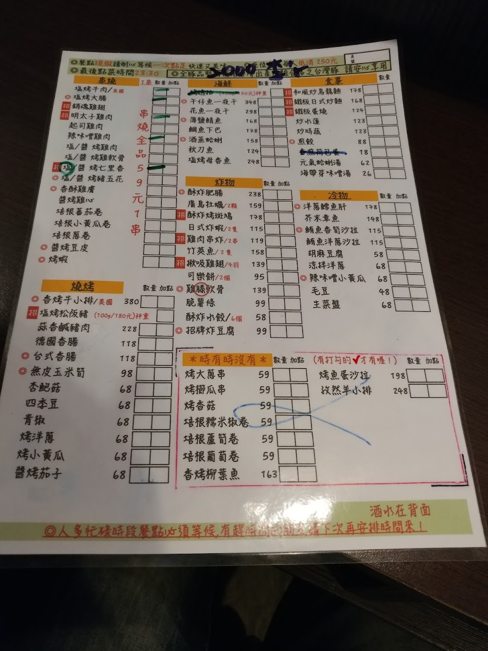 燒烤、串燒、鐵板蛋燒都很不錯吃,價位中等,店內座位雖不多,但全坐滿時,等待時間蠻長的,不趕時間可以坐著喝飲料聊天慢慢等。缺點是店內有些餐點是電話叫合作的外賣廠商,外賣廠商外送到店裡後,店家在重新擺盤。看到熱騰騰的炒麵裝在塑膠袋,有點傻眼,怕塑化劑的人不適合,生魚片價位不廉價,但吃起來比爭鮮還糟糕。下次在光臨,會避開同業結盟那一排。