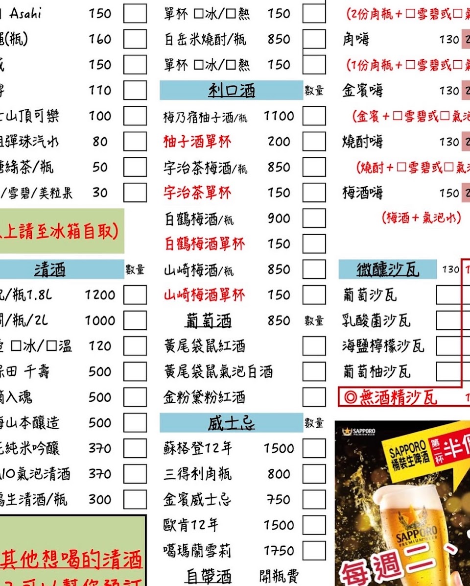 平價的日式居酒屋,老闆和老闆娘都很親切;菜單上提供有串燒類、烤物類、沙拉、湯、酒精飲料和無酒精飲料等,另外還有些菜色是和其它店家合作的,比如提供有冷盤生魚片、熱炒、炒飯/炒麵、炸物拼盤,這些說明菜單上都有標示的。