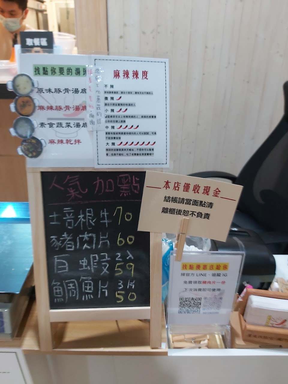半夜肚子餓想吃熱的鍋,google後抱著嚐鮮的心態來試試。湯頭比想像中還要有水準,已是連鎖麻辣燙等級的湯頭,且食材乾淨新鮮,鴨血軟嫩尤其隨鍋附贈的乾碟配上鴨血真是一絕,價位部分是以秤重計算,粗估比連鎖麻辣燙(三X茅X、老X覺現在隨便夾一夾都很貴)還要便宜一些,總之CP值不錯!宵夜好去處下次必回訪試試別的湯底。