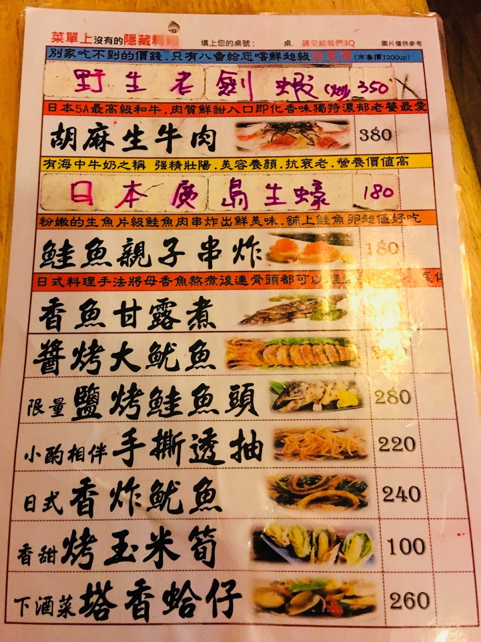 蔥鹽雞腿 明太子玉子燒, 羊肉串, 酒蒸蛤蜊, 起司洋蔥雞腿肉串, 明太子烤飯糰, 烤秋刀魚 毛豆 菲力牛排 墨魚沙拉, 烤香魚, 明太子泡菜豬肉串, 烤青椒, 蔥爆豬五花, 烤牛菲力, 炸雞軟骨 唐揚雞, 培根干貝燒, 川燙透抽, 炸蝦天婦羅