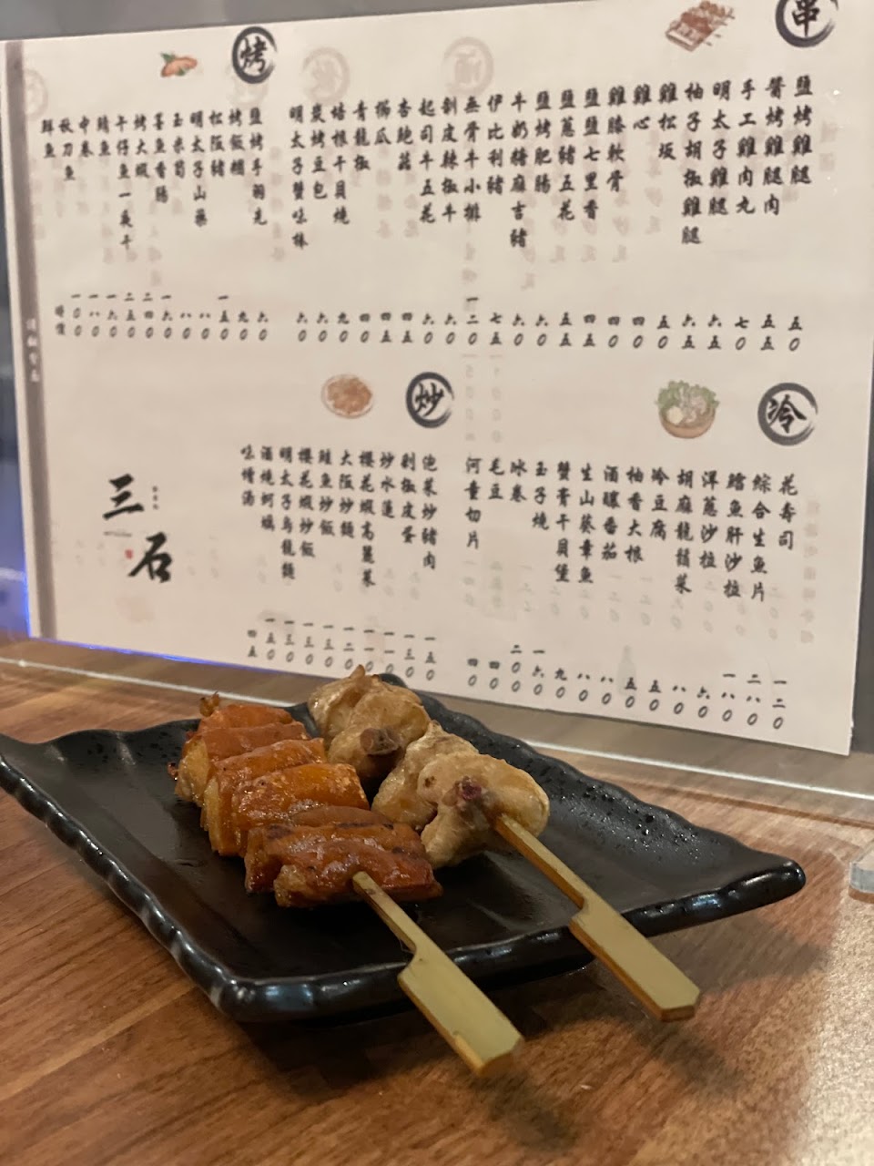 10/18下班後,跟好友Kevin約吃晚餐,話說我們也很久沒一起吃飯,剛好都有空就吃頓飯吧,選了一家之前吃過一次不錯的居酒屋叫三石居酒屋,店內位置大約5張大桌,其餘是吧台位,進去後店員安排我們座吧台,也會貼心詢問是否來過,來過還是會願意再介紹,菜單分為串,炒,烤、冷、炸和甜,其餘就是飲料很酒精類,串就是串燒,炒是炒飯、麵、青菜、特殊炒物和湯,烤就是一些算份的烤物,冷就是涼拌和冷菜這類,炸就是炸物,甜就是甜點,而這裡串的串燒價錢都是一串價錢,所以幾人就是要點幾串,或者可以share分著吃,