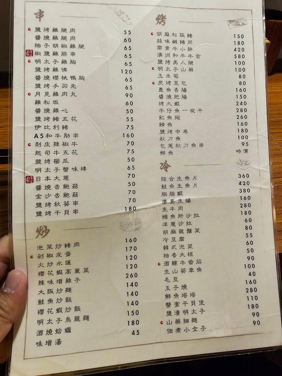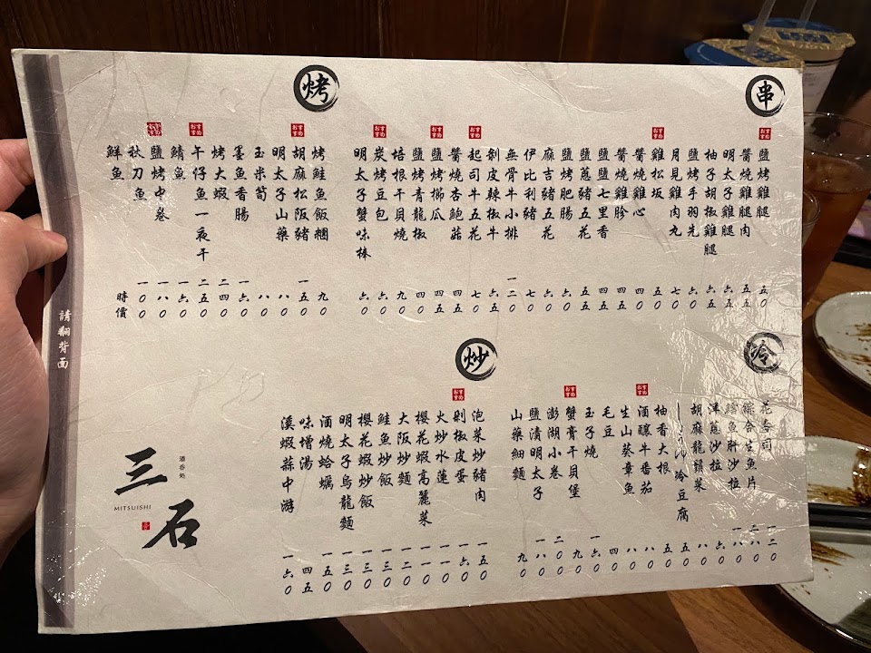 10/18下班後,跟好友Kevin約吃晚餐,話說我們也很久沒一起吃飯,剛好都有空就吃頓飯吧,選了一家之前吃過一次不錯的居酒屋叫三石居酒屋,店內位置大約5張大桌,其餘是吧台位,進去後店員安排我們座吧台,也會貼心詢問是否來過,來過還是會願意再介紹,菜單分為串,炒,烤、冷、炸和甜,其餘就是飲料很酒精類,串就是串燒,炒是炒飯、麵、青菜、特殊炒物和湯,烤就是一些算份的烤物,冷就是涼拌和冷菜這類,炸就是炸物,甜就是甜點,而這裡串的串燒價錢都是一串價錢,所以幾人就是要點幾串,或者可以share分著吃,
