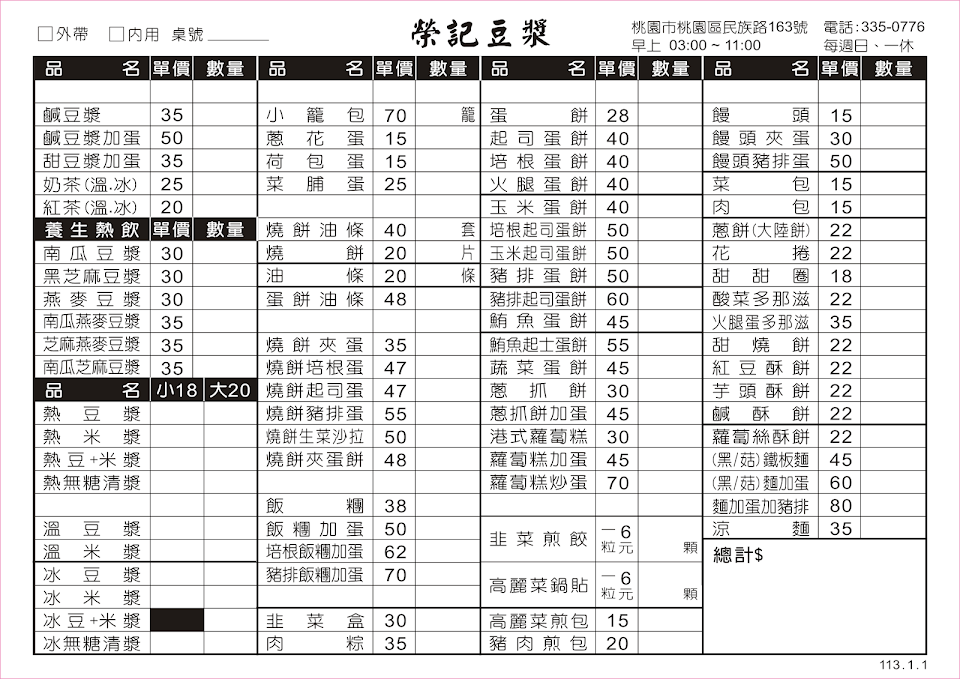 現在少有的好吃中式早餐!店內的餐點大多數都是自家現做的!燒餅、油條、飯糰、鹹豆漿、豆漿、米漿…等 ,幾乎都超好吃!!燒餅現在少有的好吃又是自己做的!飯糰更是好吃!鹹豆漿一流!料多實在又不貴!休假一定要去吃的!找不到比榮記好吃的永和豆漿! 服務 外帶 餐點類型 早餐 平均每人消費金額 $1-200