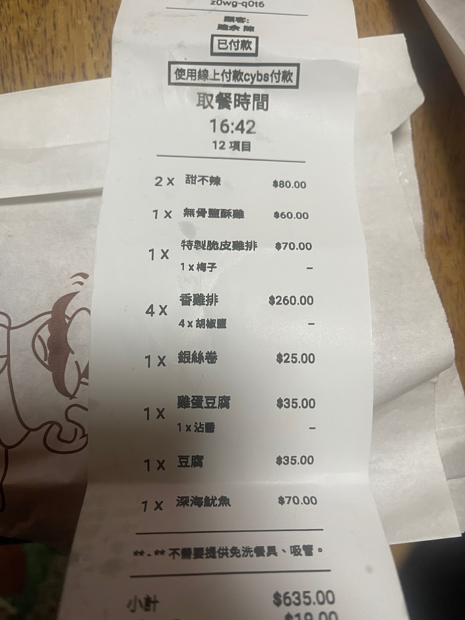 在Uber Eats上訂餐,沾醬雞排90元,不算貴,現場好像75還80元,下次去現場光顧。