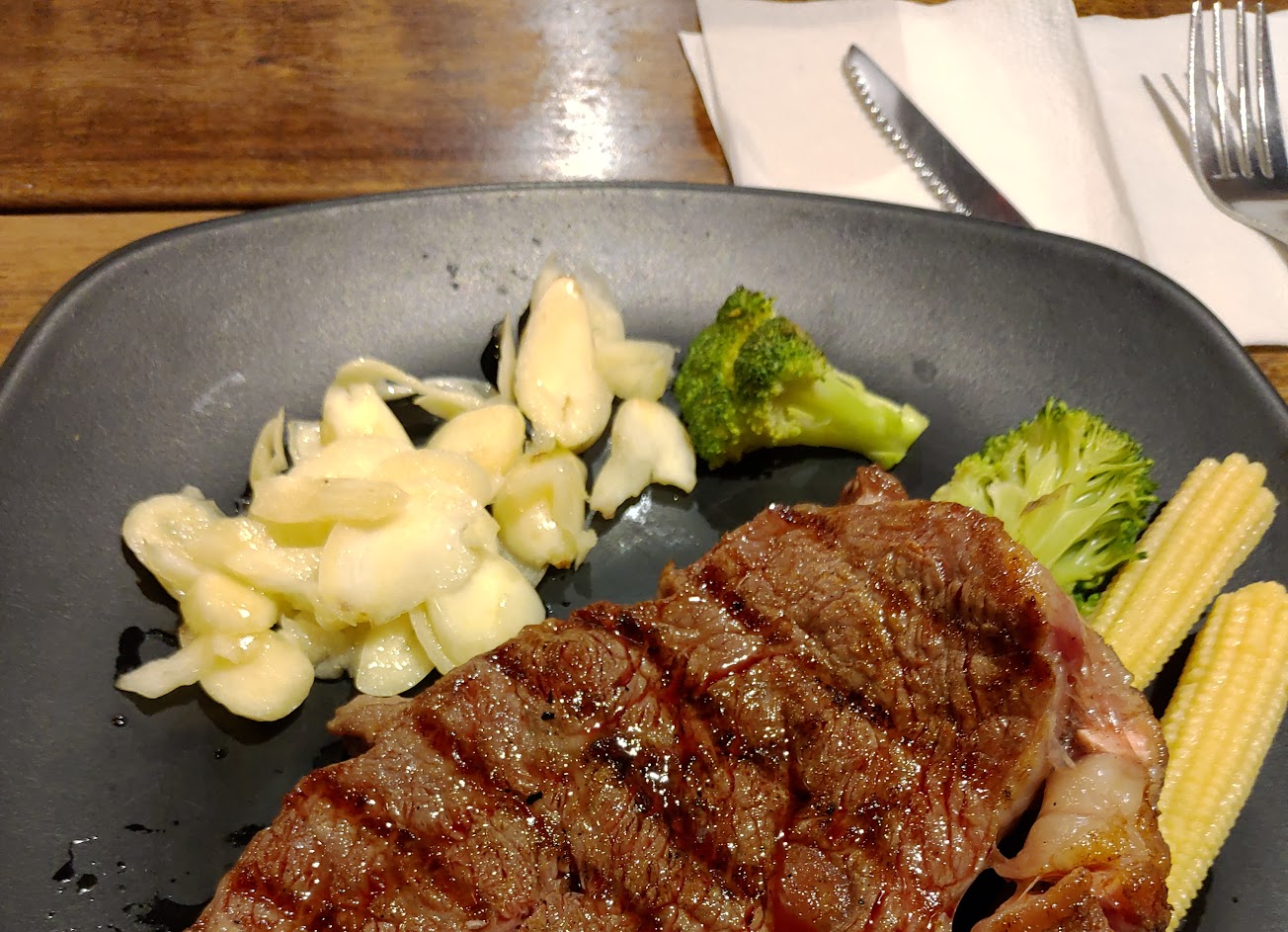 這次品嚐的是290元的牛肋條,吃原味,沾些鹽就很好吃了,軟嫩帶勁,口感個人覺得恰到好處。切成骰子牛形狀,不用牛排刀,只要使用叉子就行。隨餐附奶油玉米濃湯(偏甜,桌上有玫瑰鹽,可自己調味)、可樂。喜歡蒜片的人,還可以再跟店家要,很貼心。