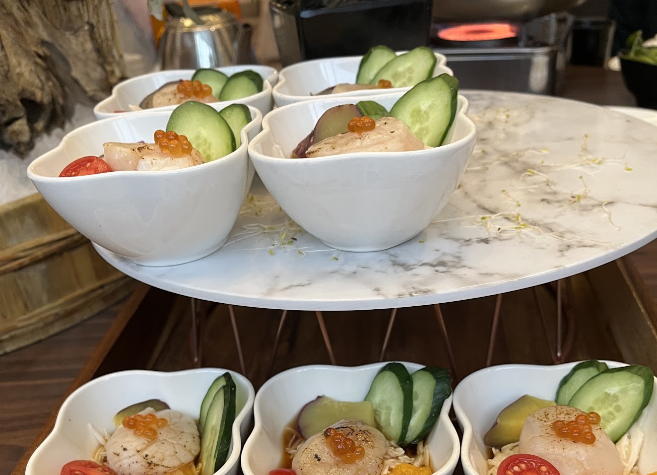 點餐前有跟服務人員詢問1000/1500的差別,服務人員表示食材比較高級,所以點$1500無菜單四人份, 第一道火鍋海鮮部分三隻蝦、兩個淡菜、兩個扇貝、兩塊魚,四個人都不夠,看到都傻眼了,反應後服務人員說幫忙更換,重新上鍋多兩塊魚,幾塊小捲⋯ 其中一道魚的料理還有火鍋料搭配,明明是訂日本料理吃起來像是吃辦桌,實在看不出來高級在哪裡耶! 價錢花的非常不值得 上菜很快完全沒有看客人用餐進度一直上,桌上也沒有幫忙整理,塞的滿滿的,要自己開口請服務人員幫忙收才會來收 然後我們座位後面就是一張大長桌,小菜直接用鐵盤裝著外面套一個塑膠袋也沒有封口擺在桌上,衛生品質有待加強
