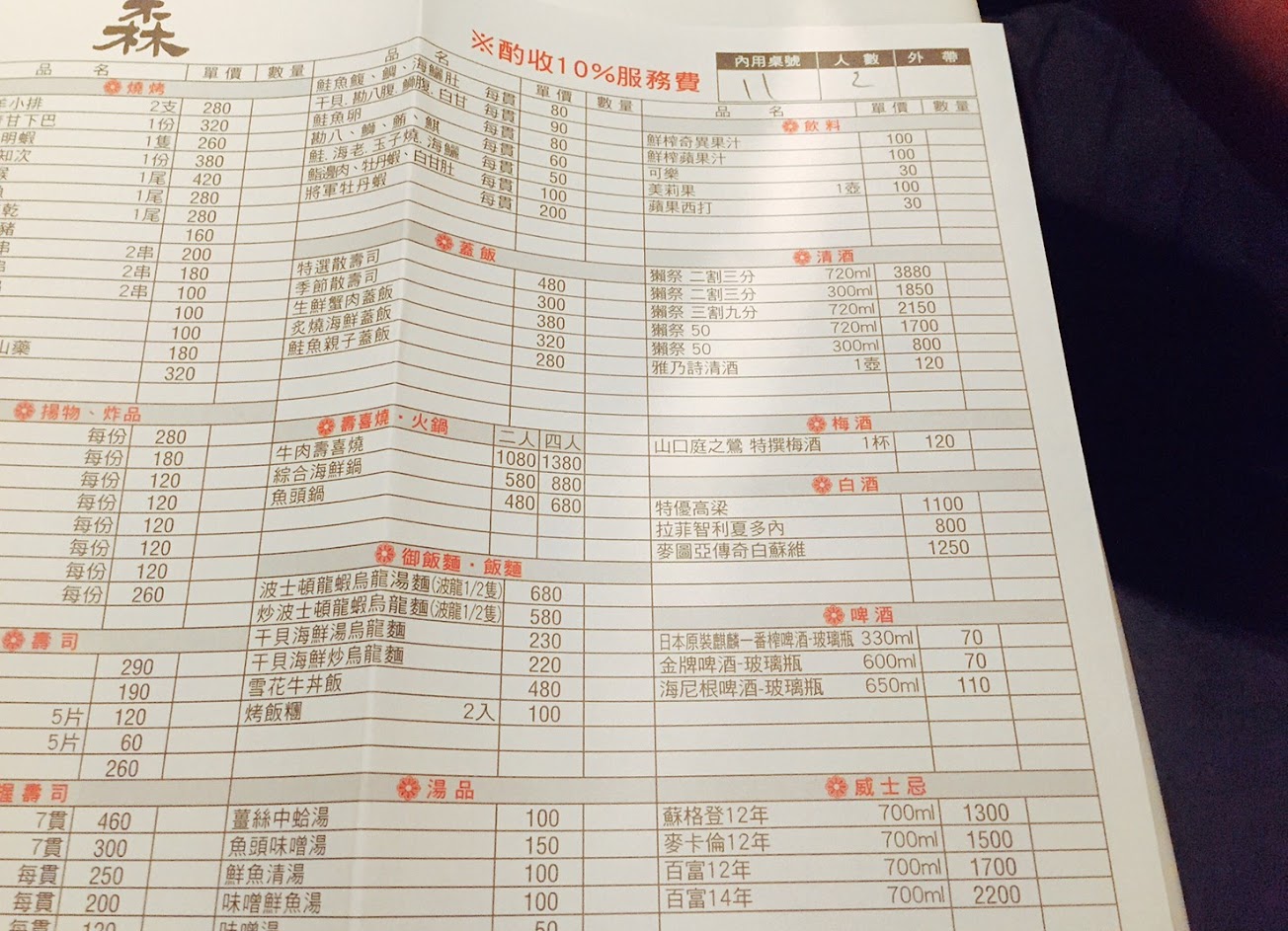 讚。日式建築 室外庭園 海鮮 波士頓龍蝦 和牛 價格合宜?現在的評論 人頭超多 部落格 邀約吃客滿地是 森日式料理在網路上的部落格幾乎都是邀稿吃客寫手 不客觀 不具參考價值。Google地圖的評論 又多是一次評論 參考價值太低。最後還是決定來吃看看。家裡八個人二台車,包廂滿了 是在一般一樓空間,由於周圍是玻璃室外又有景跟公園,室內挑高至少超過四米,整體坐在裡面 無壓迫 無不舒適 靠近玻璃落地窗應該會更好。服務人員推薦點套餐(1688+10%/人)六人,八人享用,由於是混合上菜,雖然不能每人都完整一份但也可以分享著吃,份量也夠。上菜後沙拉(鮑魚六顆都有對半切),波士頓龍蝦蒸煮(應該有三隻),綜合生魚片,干貝炸牡蠣,龍虎斑,雪花牛,和牛炒飯(三人份),花壽司(三人份,唯一覺得不好吃,沙拉醬跟壽司搭配覺得很不搭),火鍋,清蒸野菜(養生但不愛,但不錯吃),甜點水果。平均每人約1393元。這樣價位不算低,但食材新鮮料理也很到位,服務人員也親切。建議可以去吃看看。我給評價五星,也是因為家人都很滿意,媽媽也少見的要了名片,不過她以為是300~500價位,知道是平均約1400元還會不會去就不知道了。哈哈