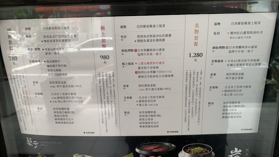 現在菜單改成三式套餐,分別是經典698,極上980,名物1280元。每三式含七款餐點,三款最大的差別在主餐(名物強肴)。