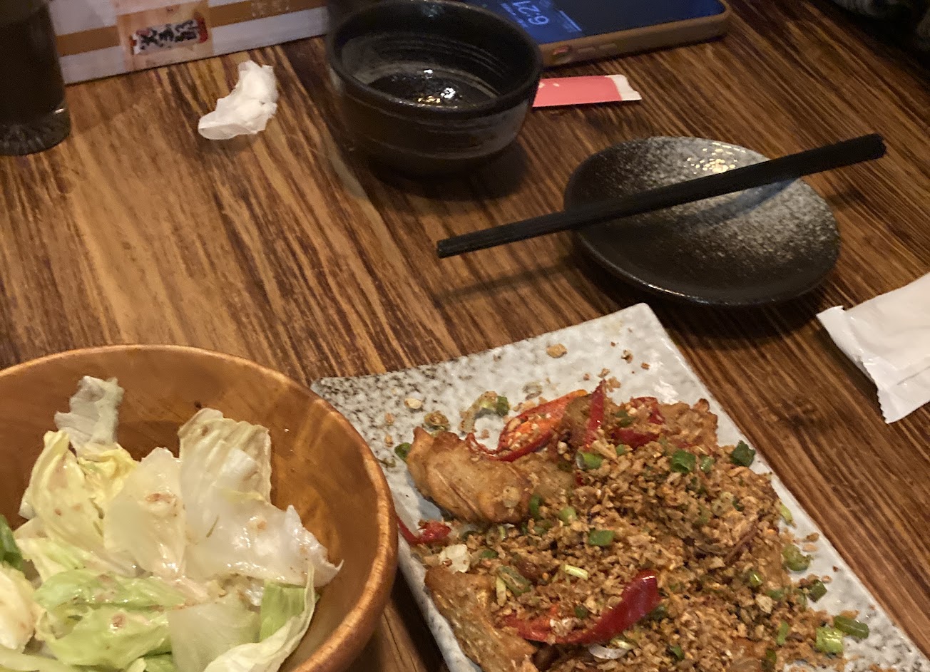 工作完臨時來吃滿不錯的 打卡和當月壽星還另有招待小點 個人喜歡鮭魚炒飯?? 豬喃排真的是完全沒肉都是筋 我不太喜歡? 可能有些人特別愛啃~ 酒的選擇也還算多 都可以單杯買 吃的還蠻飽的 餐點:3 服務:4 氣氛:5
