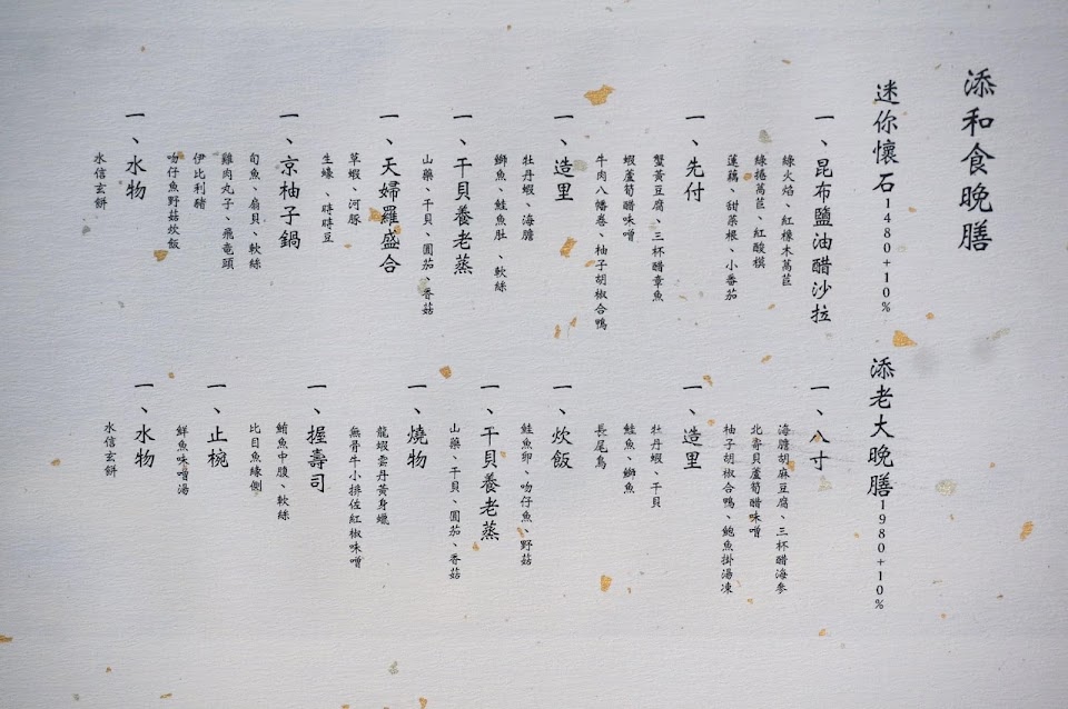 餐點是無菜單料理,蠻有特色的,店裡所用的餐具都是老闆日本帶回來的,很精緻,唯一的缺點就是炎熱的夏天在店裡用餐,冷氣無法普及,又加上照明的燈具很熱,一頓飯吃下來,汗如雨下非常的不舒服,間接也影響到品嚐美食的心情