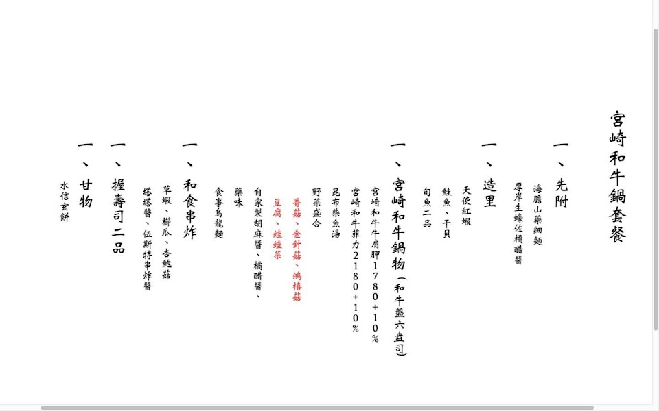 幾霸昏 服務 內用 餐點類型 晚餐 平均每人消費金額 $1,400-1,600 餐點:5 服務:5 氣氛:5