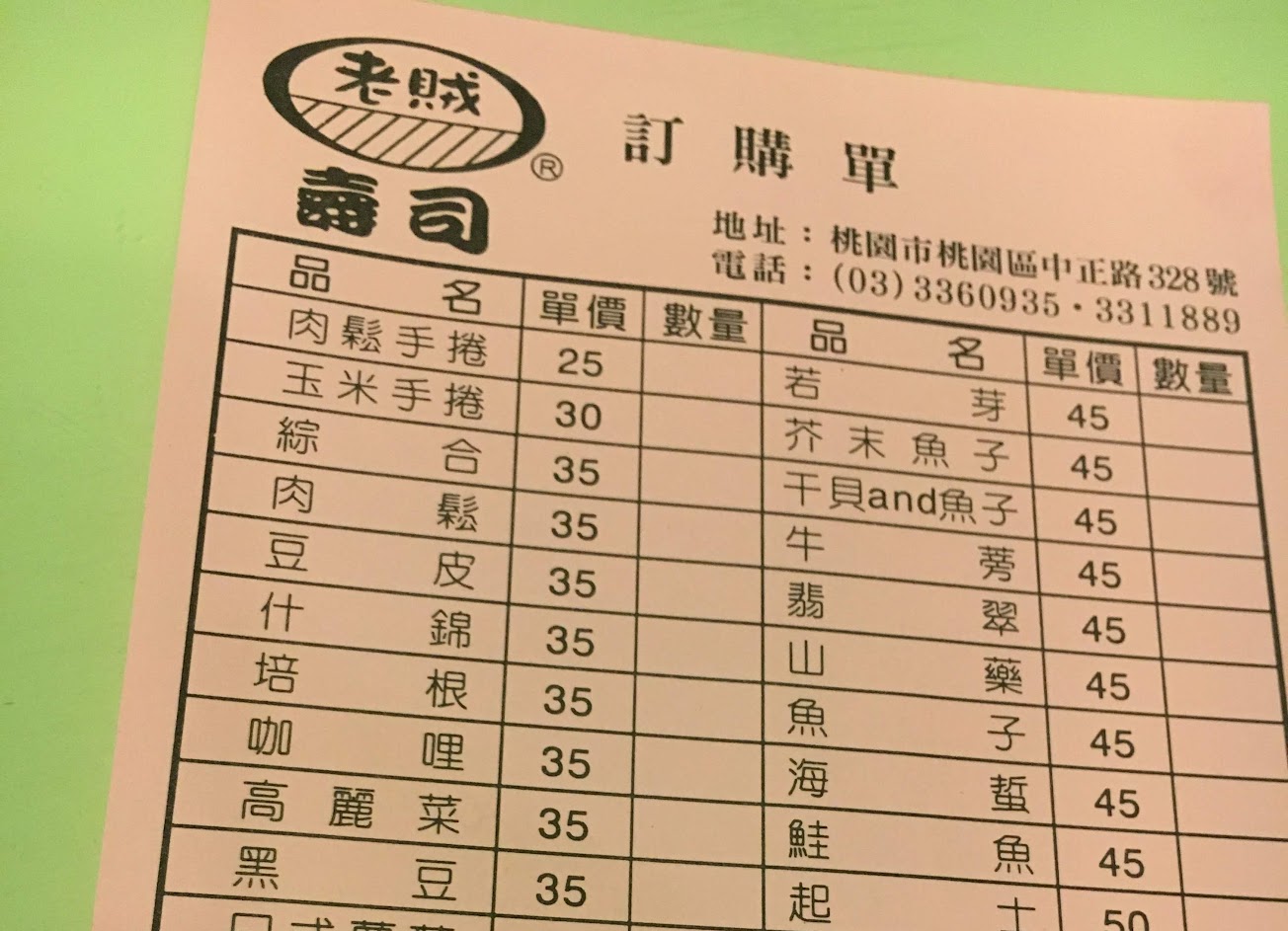 價位:便宜 環境:普通 衛生:感覺可以 感:老賊壽司是位在大廟後面大馬路上有名店,壽司種類繁多便宜又好吃,值得吃吃看的壽司店。