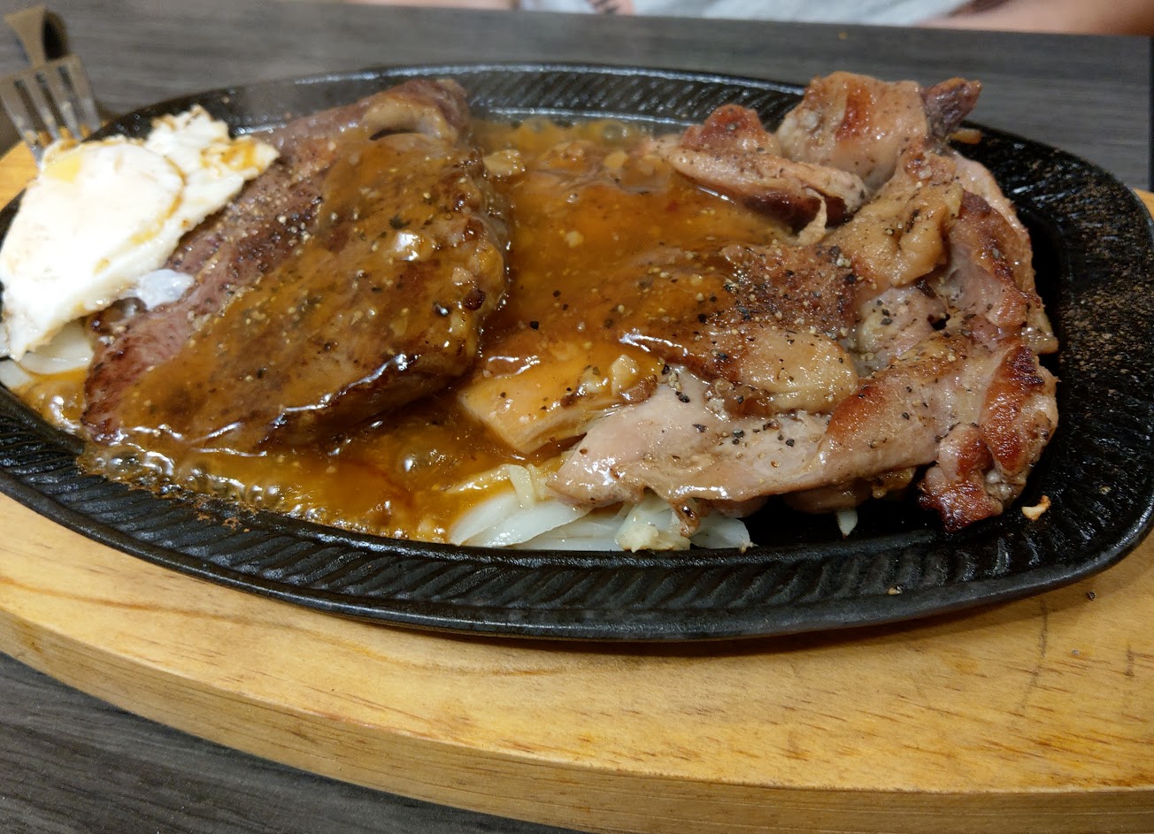 點了豬加雞,牛加雞兩份雙拼 豬排肉超級嫩又很厚又多汁!完全不柴 !即使不加醬也超級好吃! 雞排肉質也很嫩比一般平價牛排好吃 但牛排肉質一般般 自助吧有可樂,咖啡,奶茶,爆米花,紫菜湯和玉米濃湯,算蠻豐富的! 值得一提餐包超級好吃!是爆江的那種 平均一人260 CP值頗高 值得再訪 下次我會點豬加豬的雙拼!