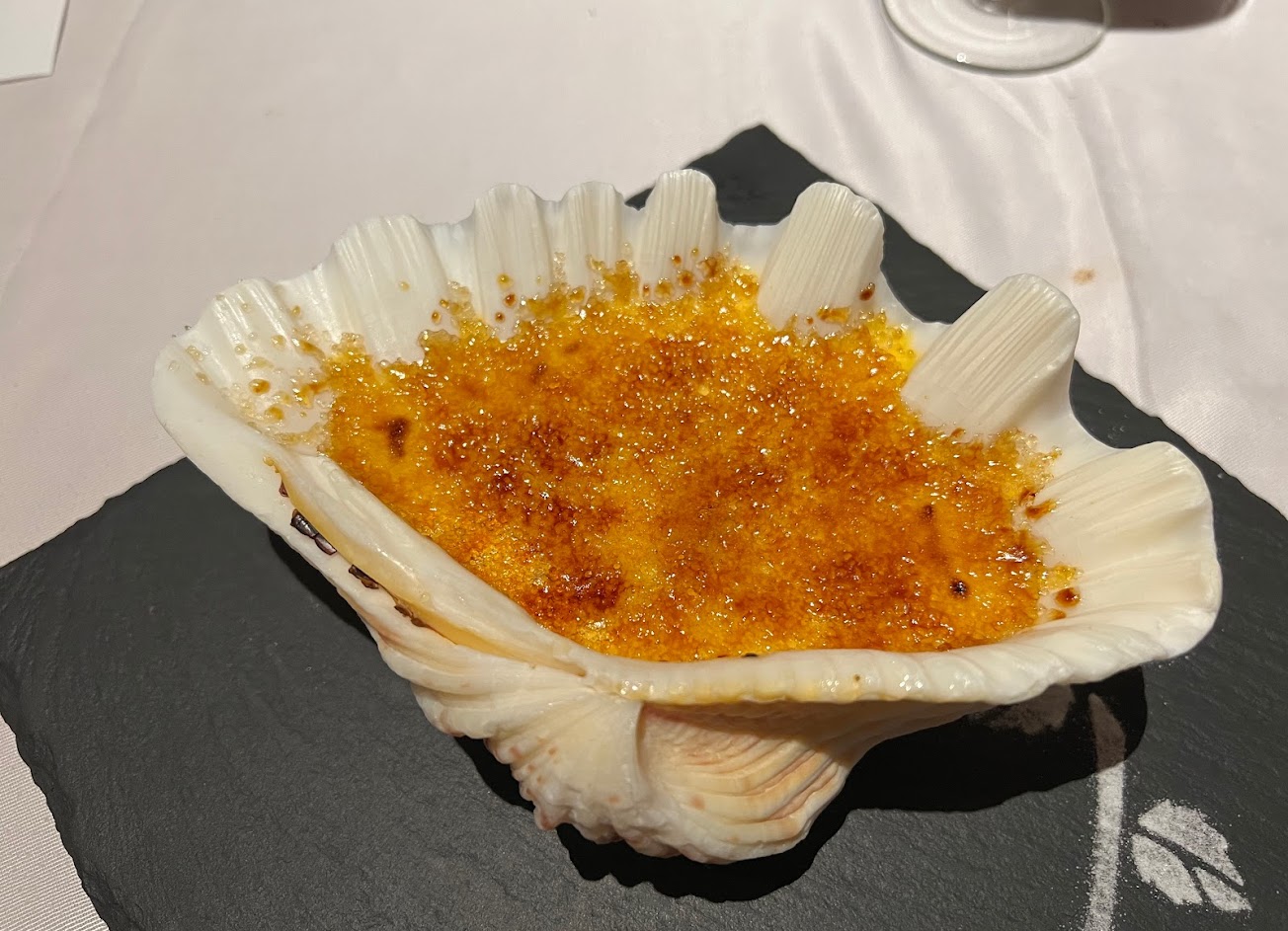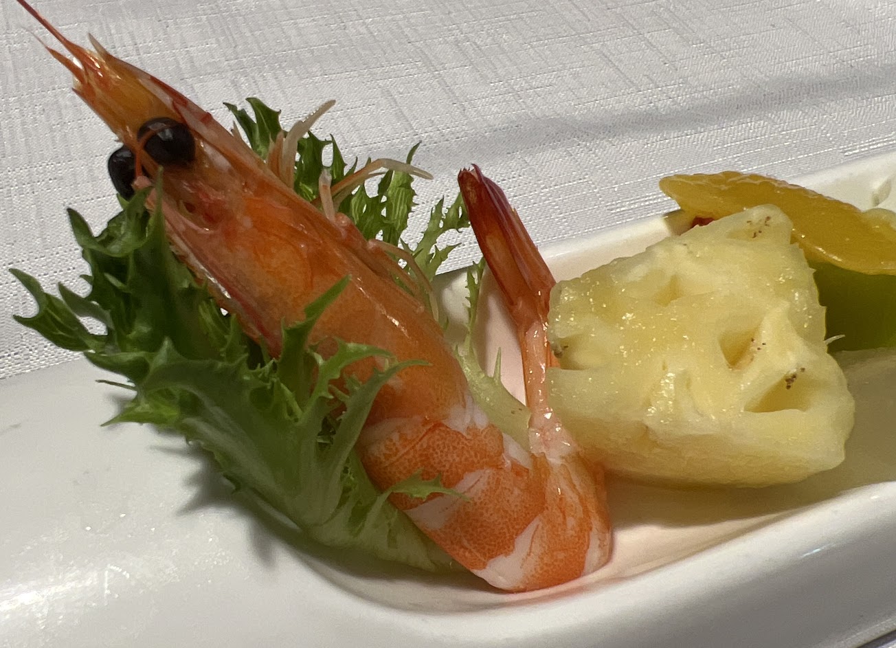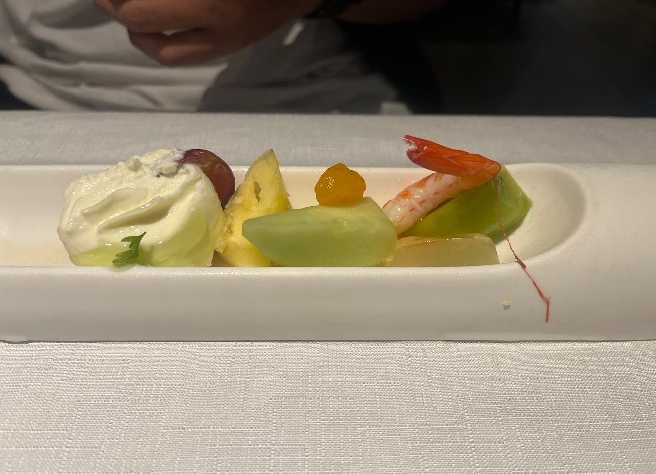 從桌面開始說,連桌布都不平整;再來麵包只有一種選擇,附贈的奶油不知道是因為天氣冷還是怎樣硬到不行;沙拉名叫燻鮭魚沙拉,但燻鮭魚這麼便宜的食材只小氣的給了三片薄片;蘑菇濃湯不錯有水準;梅子冰沙淡然無味,很像在吃梅子口味的刮鬍泡;主餐的和牛過熟,也不像澳洲頂級和牛的口感,油花非常不明顯,配菜也沒有搭配合適的醬汁,只能沾著少得可憐的牛排醬或玫瑰鹽吃,海大蝦整條都是粉粉的口感,一點都沒有蝦的鮮脆,完全不新鮮;餐後甜點用一個會一直傾倒的貝殼裝著,吃個烤布蕾動來動去,烤布蕾口味也很普通,隨便一家西餐助手都做得出來;餐後果汁服務人員介紹三種蔬菜水果打成,喝起來卻平淡無奇。