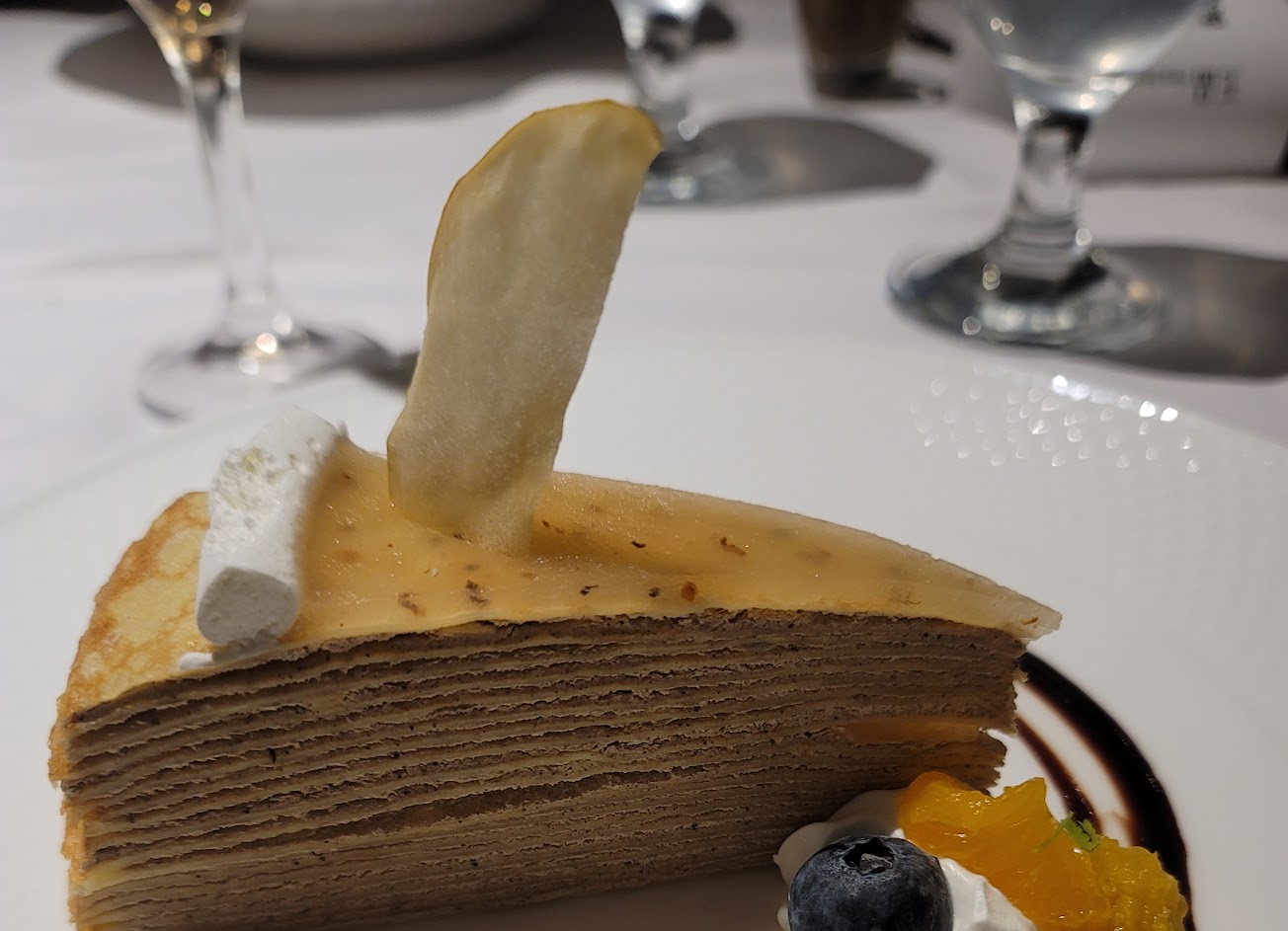 甜點的布蕾焦糖很硬,老人家要吃的話得考慮一下;千層是個不錯的選擇,淋上伯爵茶醬的風味更棒!