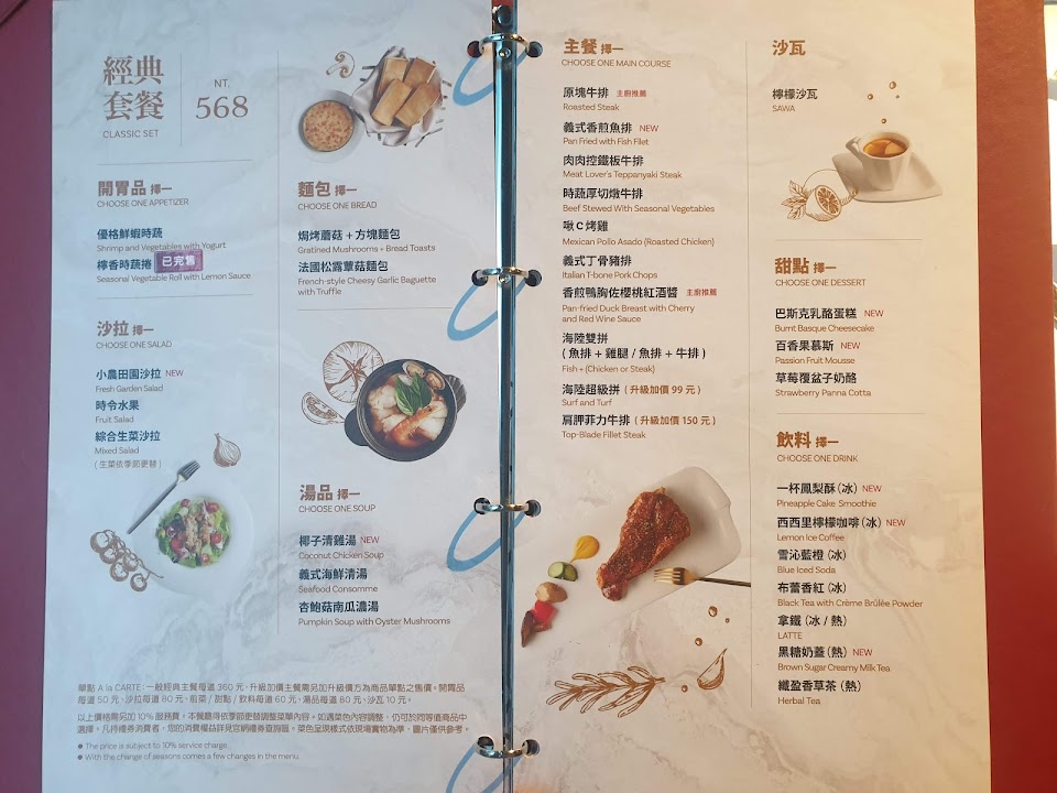 原塊牛排, 法式松露菌菇濃湯, 松露蕈菇法國麵包, 法式香煎鴨胸, 重磅肉肉控鐵板牛排, 義式海鮮清湯