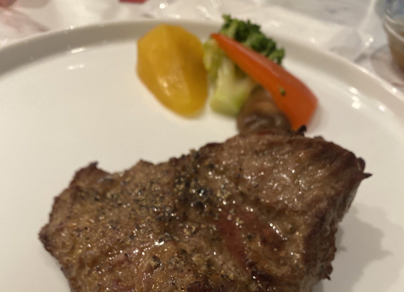 今天的主餐牛排熟度不依,有些地方過軟導致口感不好,餐前的麵包也不夠熱,後來要求重烤才改善。