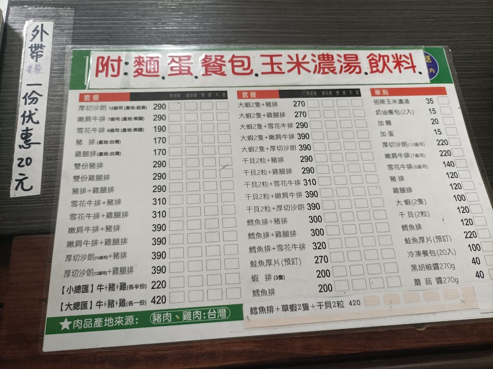第一次點我是叫外送,雙份牛排很好吃,還有附贈湯跟飲料跟餐包,我老公點雞排加麵,他說吃很飽