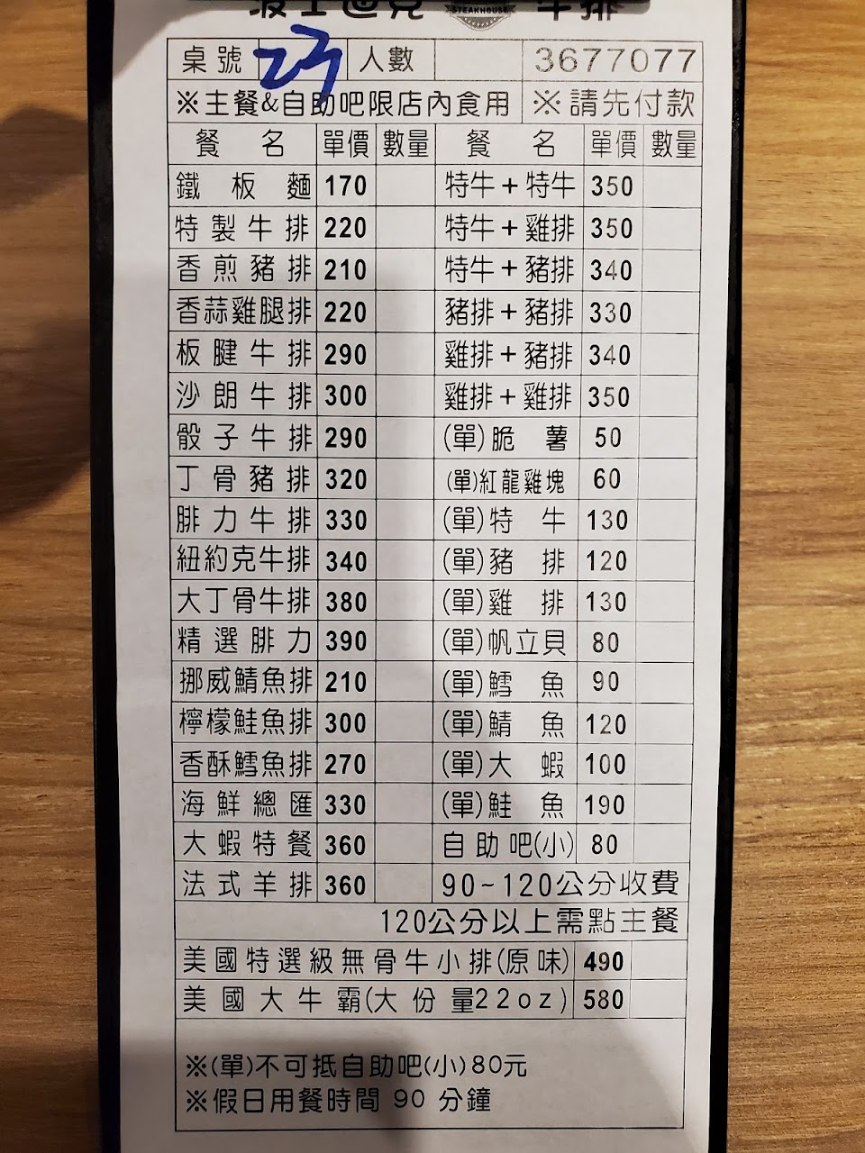 第一次來試試,我們點了特製牛、板腱牛、雞排、豬排、挪威鯖魚,足夠的麵量,加一顆蛋,還有豐富的半自助吧,有鴨血臭豆腐、麵線、烤厚片吐司,冰淇淋、蘿蔔丸子湯、玉米濃湯,無限取用,黑胡椒醬也是自取需要的量,還有一些花草茶葉選擇,研磨咖啡還是UCC唷,還可購買它的咖啡豆呢,再來就是一些汽水飲料選擇,最讓我喜歡的是有原味氣泡水的選擇,無限暢飲,超級棒!主餐的份量物超所值,真的是CP值高,肉質好吃,但豬排覺得一般般普通,其他真的值得推薦好吃唷!