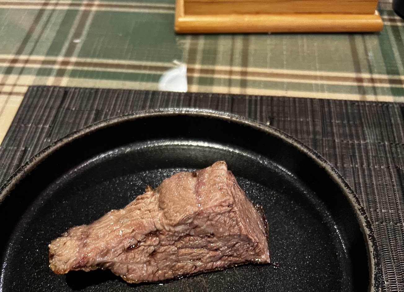 主餐第二道(牛肉肉筋面!?),整體偏嫩帶油脂,吃起來有些微愉悅感,但我拿到的尾端烤焦,有一部分吃起來像乾燥過後的劣質牛肉乾,整個扣分。