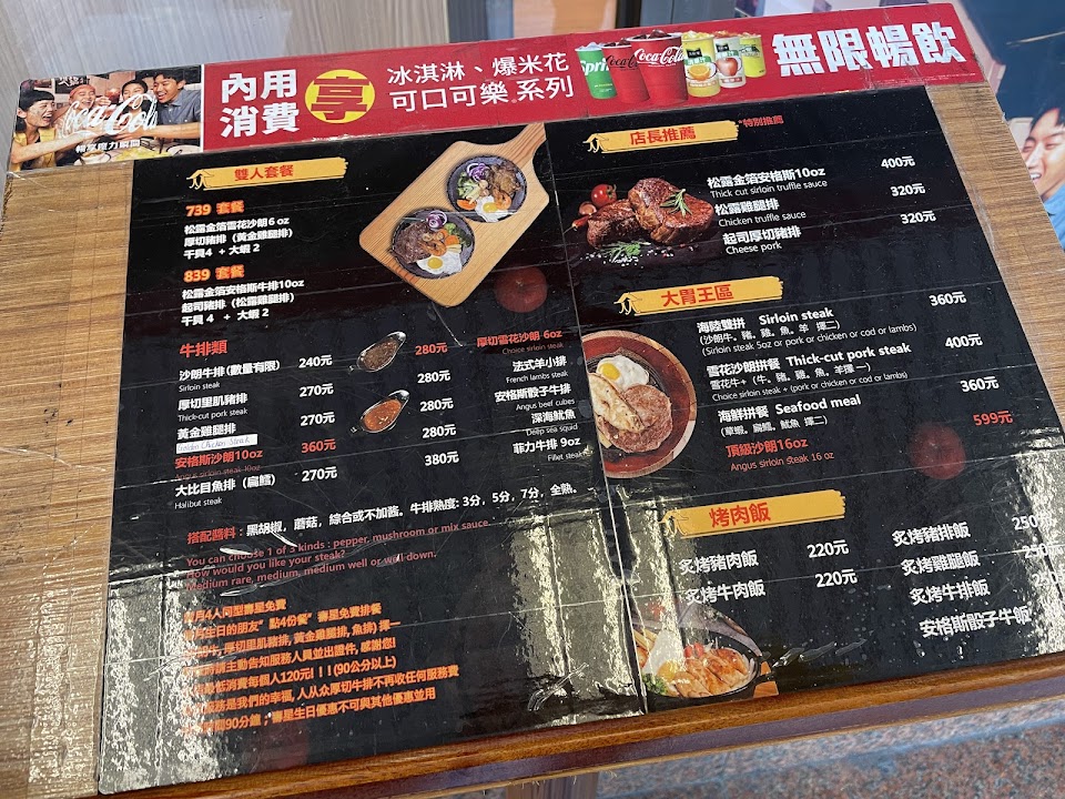 價位從200塊沙朗牛排起跳,平常有大蒜和奶油麵包玉米濃湯咖哩和仙草, 假日還多了牛肉湯 飲料有氣泡水 汽水機 還有 咖啡 茶等等,還有客惟您冰淇淋,空間又寬敞CP值蠻高的, 不趕時間的時候來這邊坐坐, 偷得浮生半日閒,也是蠻愜意的事。