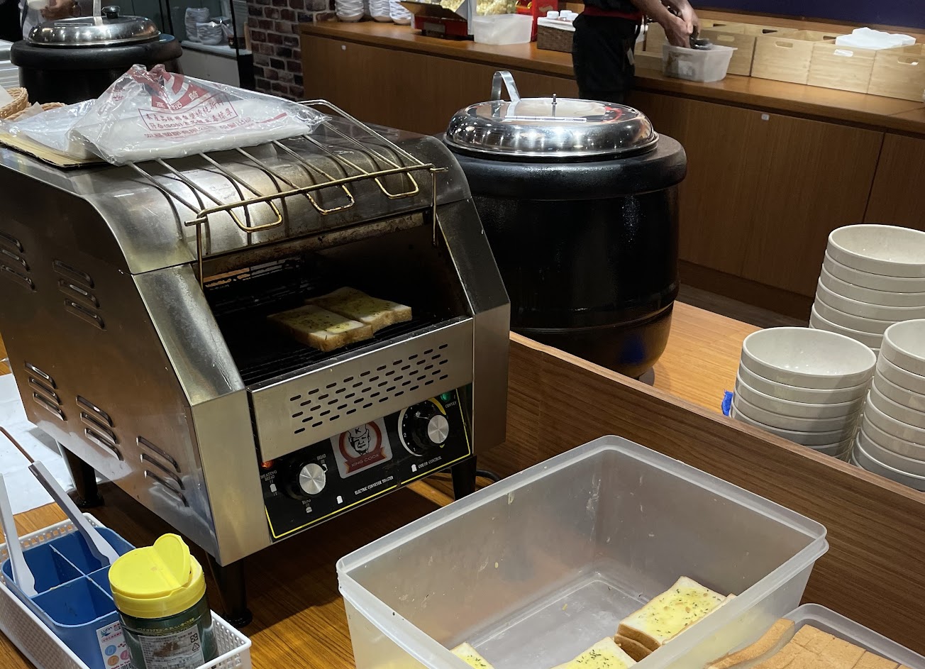 自助吧有 飲料(我去的那天冷飲有葡萄柚汁、檸檬紅茶、麥茶,熱飲有伯朗即溶咖啡和茶包)、 烤吐司(香蒜醬、巧克力醬、花生醬、起司粉)、 冰淇淋(芋頭、巧克力、還有兩個我不知道的口味)、 湯(有兩種,其中一個是玉米濃湯,另一個我不會形容,裡面有洋蔥、白蘿蔔、豬肉,顏色是棕色的)、 爆米花(奶油口味)