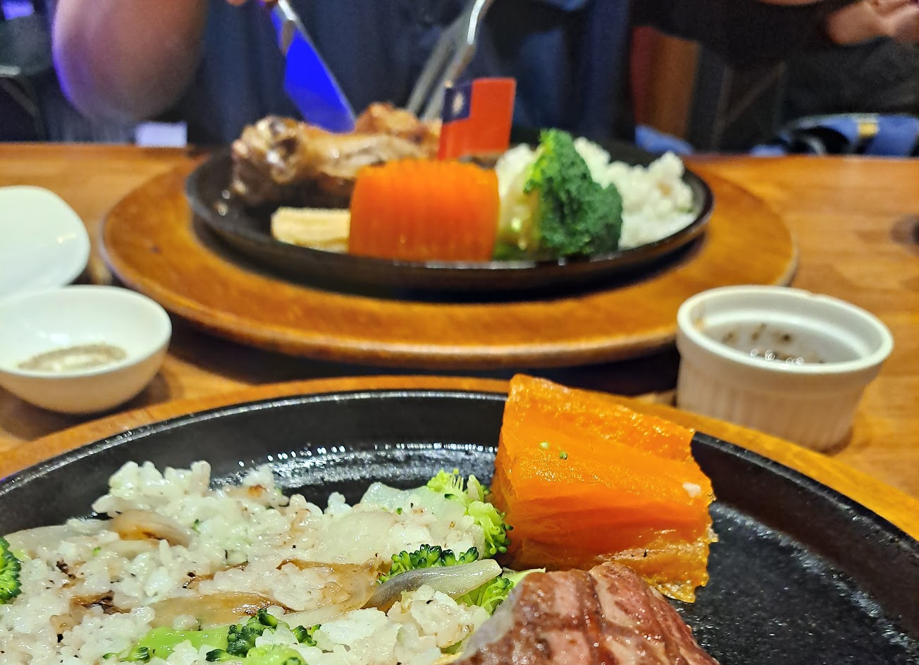 餐點的部分(忘記拍了):主菜牛排?,加購一片扁鱈(薄到不行),配菜一支玉米筍、一小朵花椰菜?、一小顆地瓜?,一球蔬菜飯飯?
