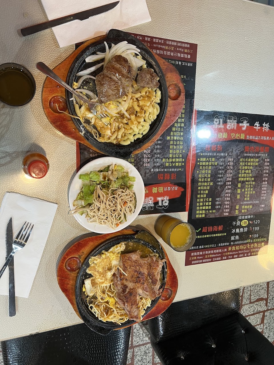 座位舒適,不會覺得很擠。調料新鮮,番茄醬很像從冰箱取出來的。自助吧有玉米濃湯、海菜蛋花湯、咖啡機、甜飲、冰淇淋、爆米花,還不錯!牛排還附餐包,點餐時註明的話,還可以加麵。麵也很好吃,是煮得好好吃的油麵!點了七分熟,牛排表面有點乾,但配上醬還是很ok的!