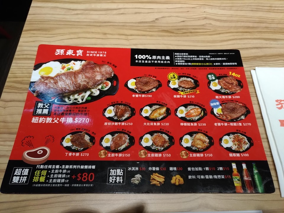 今天點了超大塊牛排及板腱牛排,牛排幾乎都是筋,連刀子都很難切,鐵板麵分量又少,排隊還排了半小時,唯一好喝的只有玉米濃湯而已 。