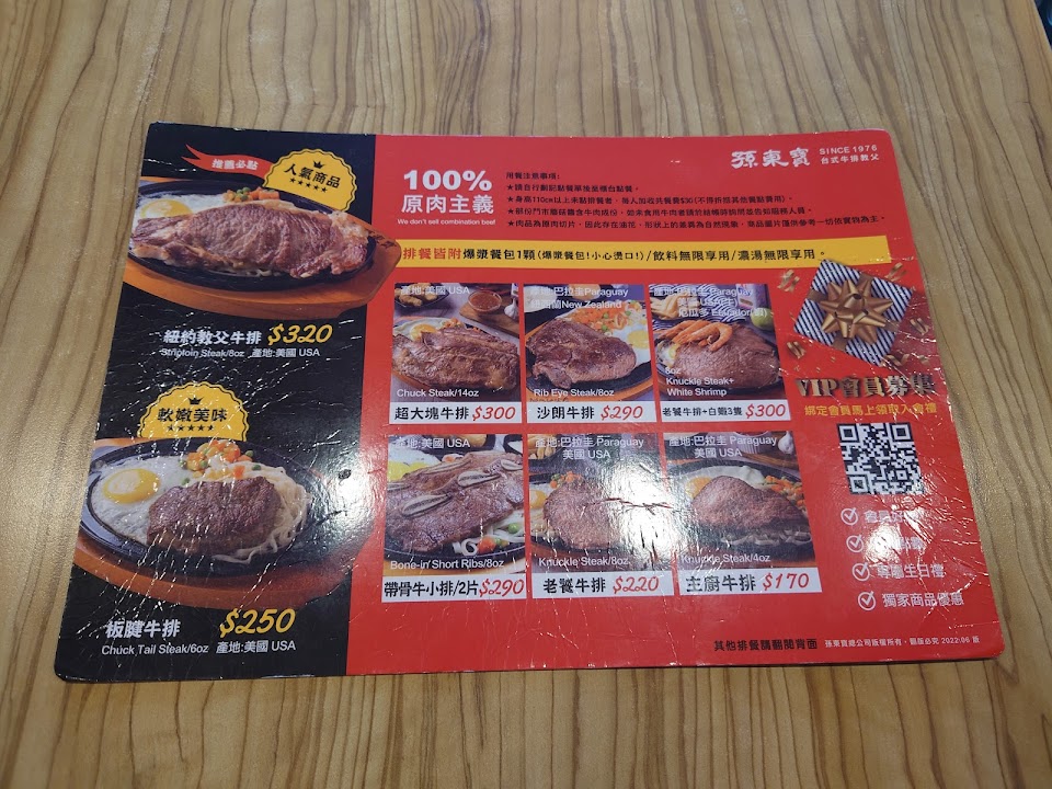 孫東寶號稱是原塊牛排,說實在我們也吃不出來其中的差別。最愛點的是教父牛排,確實好吃。有飲料、濃湯自行享用。還有餐包可吃,座位也算多又不擁擠。吃的飽是沒什麼問題的,小朋友也覺得不錯吃