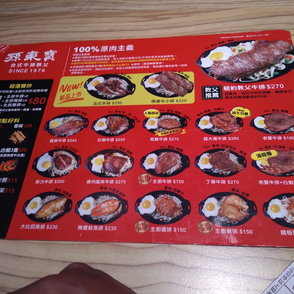 今天一進去孫東寶這麼大的外場,客人不到一半,也沒有客人再進來點餐,但我們點外帶3個牛排卻從19:09分等到19:50分,除了外場人員並沒有告知等待時間之外,外場服務小姐給我們餐點的時候,也沒有跟客人說聲不好意思久等了,希望貴店能夠好好改善外場服務態度。也建議多派內場人員,客人這麼少就可以讓現場外帶等這麼久,若是滿桌了又要讓客人等多久呢?