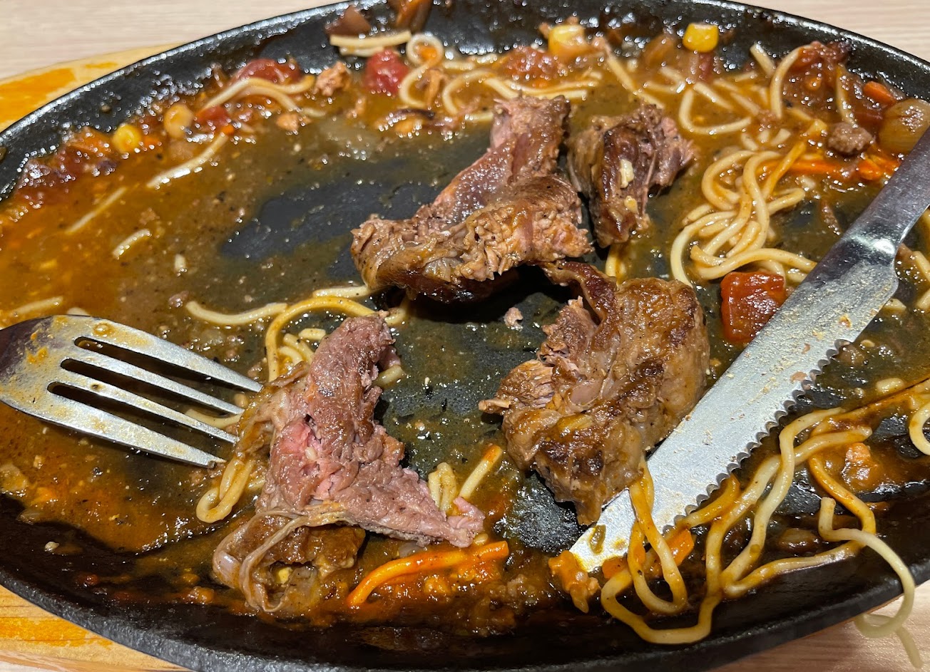 以平價牛排來說肉質算不錯 附餐豐富 鐵板麵還可以無限續 玉米濃湯也不錯喝 今日用餐唯一美中不足的地方 就是黑胡椒醬快燒乾了 有提醒服務人員但他們可能太忙了 一直沒有更換或補充 不過整體還是很棒的❤️