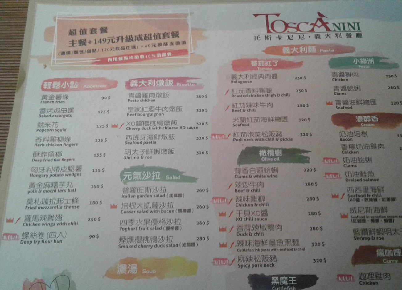 電台廣告打得很兇,某天恰巧有機會到托斯卡尼尼附近,就光顧一下,因為帶小朋友去用餐,對於服務員安排的座位,要求做一下調整,沒成想帶位人員態度很差,讓人想直接離場,礙於同伴已經去停車,要在餐廳會合,所以就忍下來。