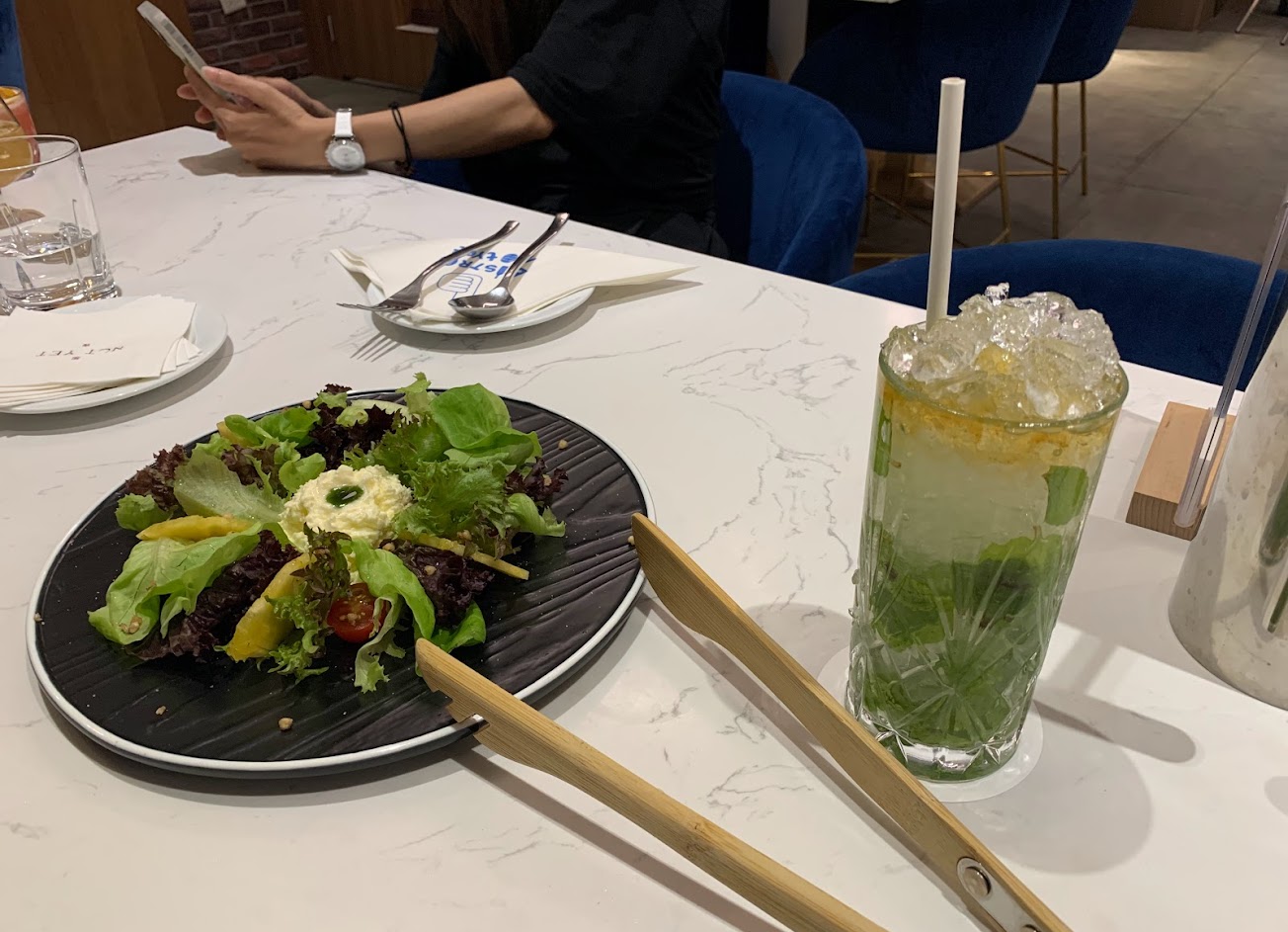 義大利麵、生菜沙拉、調酒