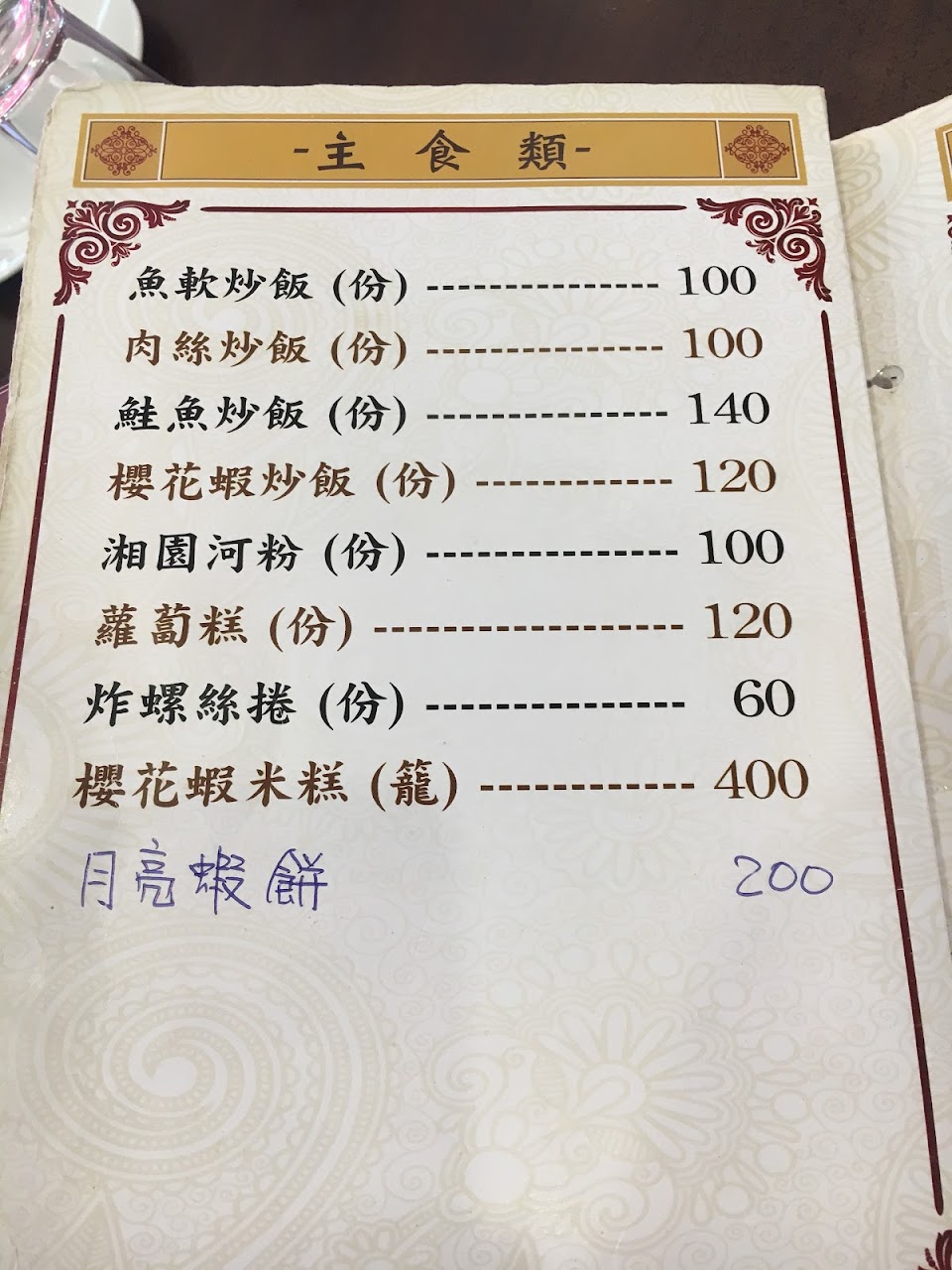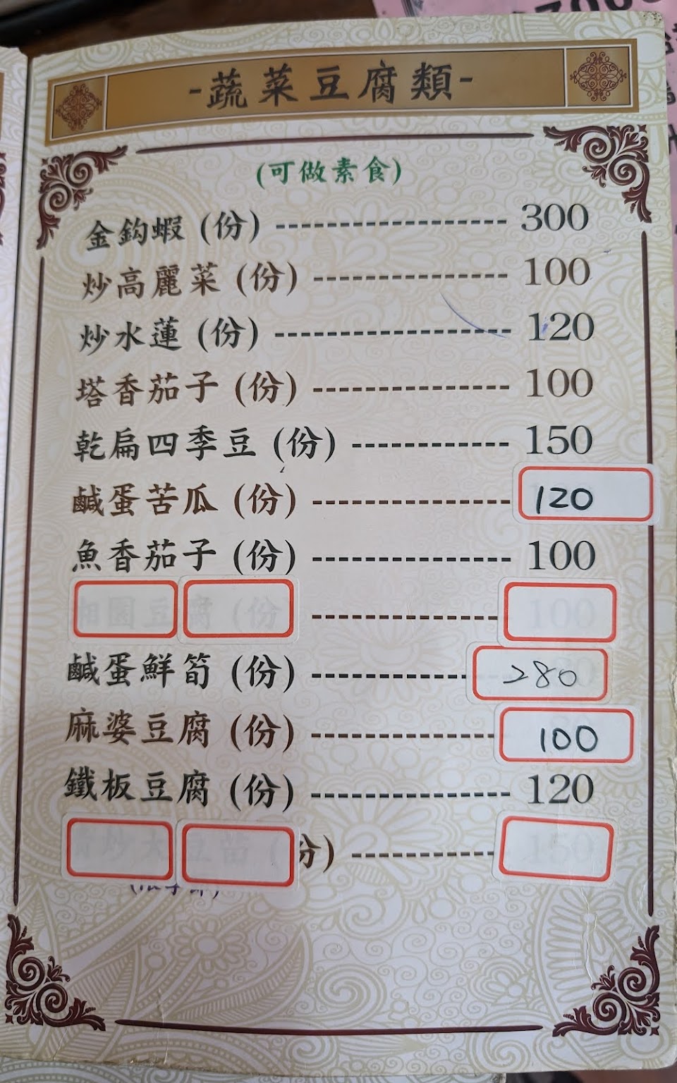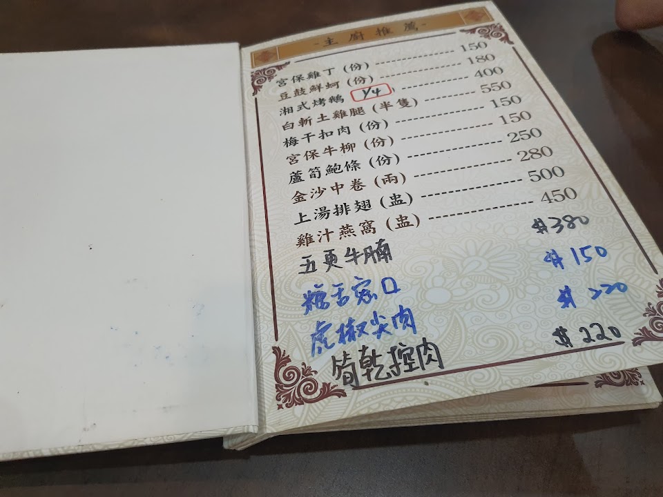 魚香茄子, 炒蛤蜊, 紅燒牛腩, 五更腸旺, 客家小炒, 宮保雞丁, 馬頭魚, 鮮奶銀絲卷, 百花油條