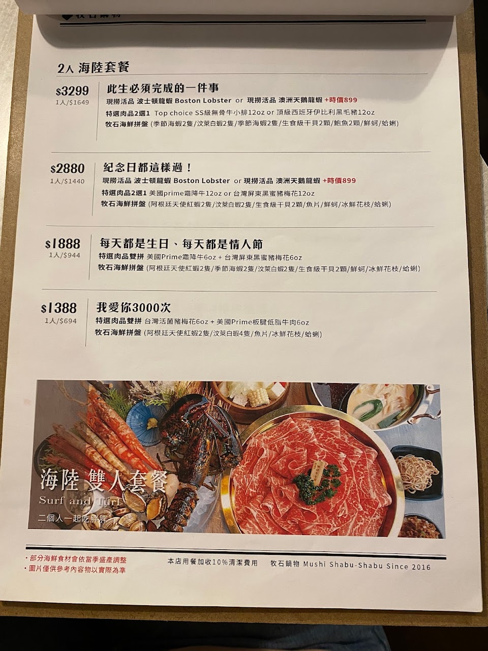 但食材真的沒話說,當天點了雙人套餐$1888裡面的牛肉和海鮮都非常好吃.店家也很貼心的在菜單上註明菜盤可以更換成肉品和海鮮,對我這種不吃青菜的人是一大福音值得嘉許