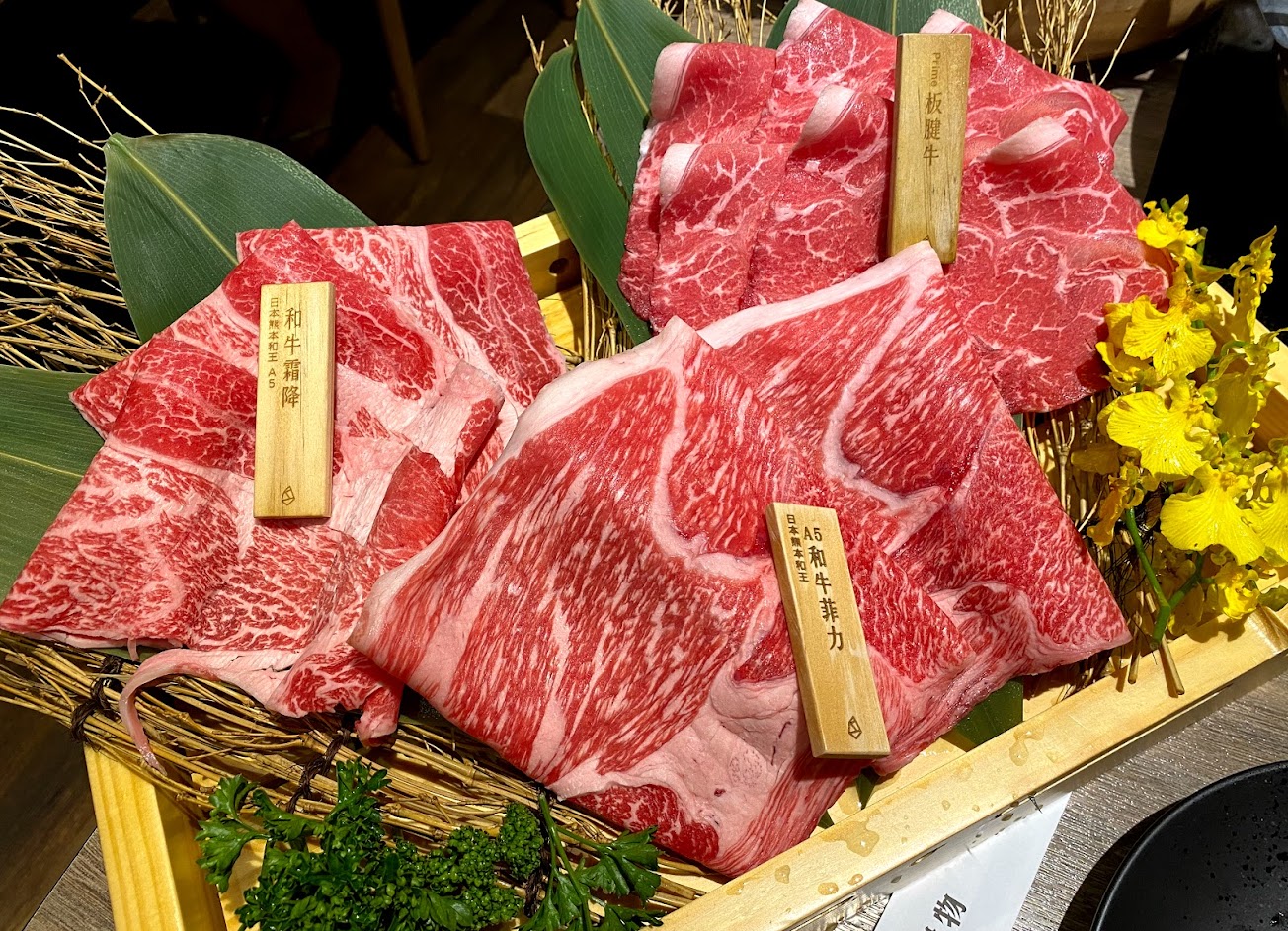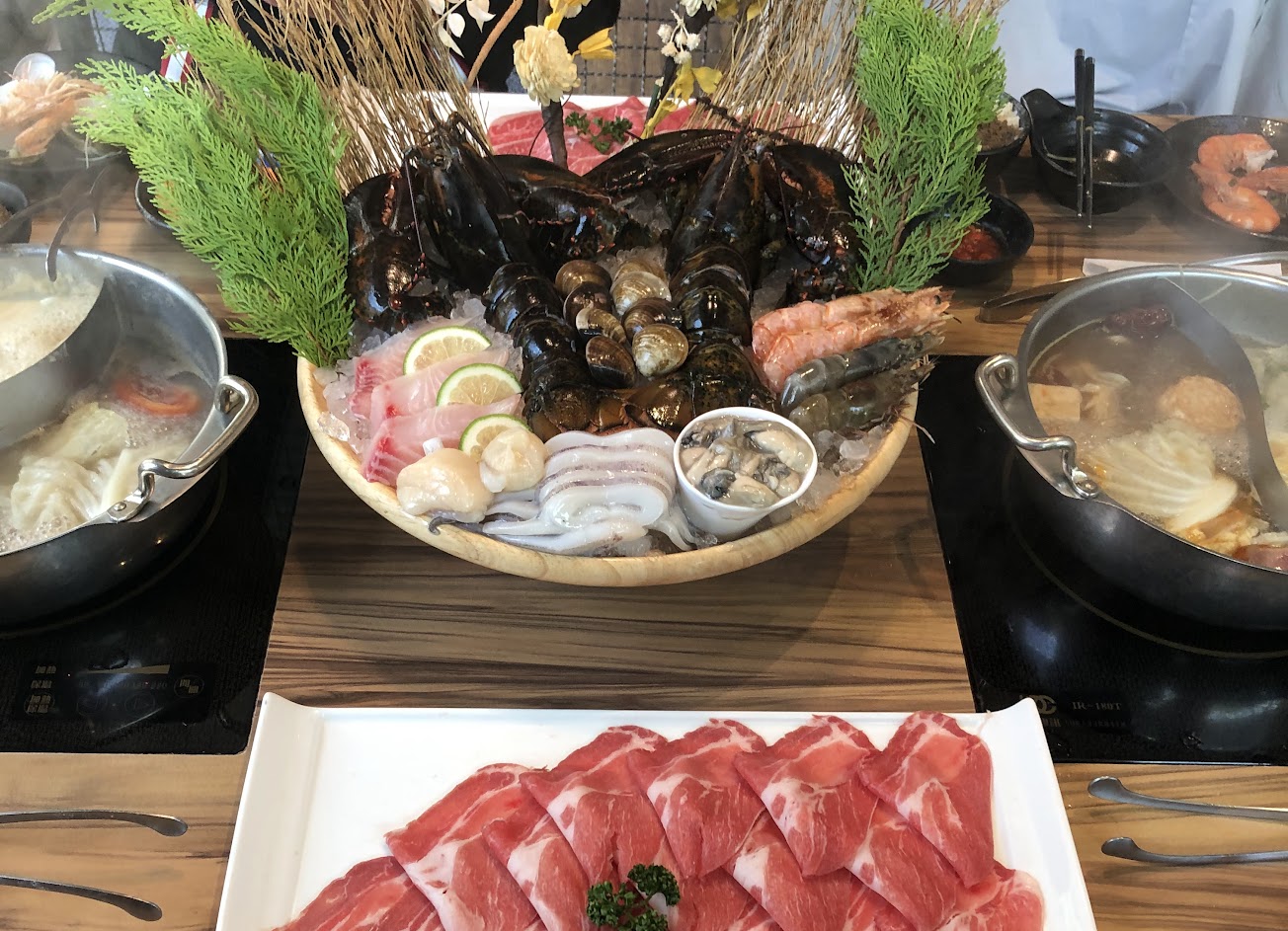 湯頭:基本蔬菜湯頭 主餐:1.熊本和王雙重奏(和牛霜降+和牛嫩肩+海鮮拼盤) 2.魚魚魚片海鮮鍋(鮭魚片+鱸魚片+潮鯛片+干貝+軟絲+干貝+鮮蚵+蛤蜊) 3.Prime 無骨牛小排 6oz 菜盤:基本菜盤 4.副餐:手工意麵/和牛滷肉飯 5.甜點:手工奶酪
