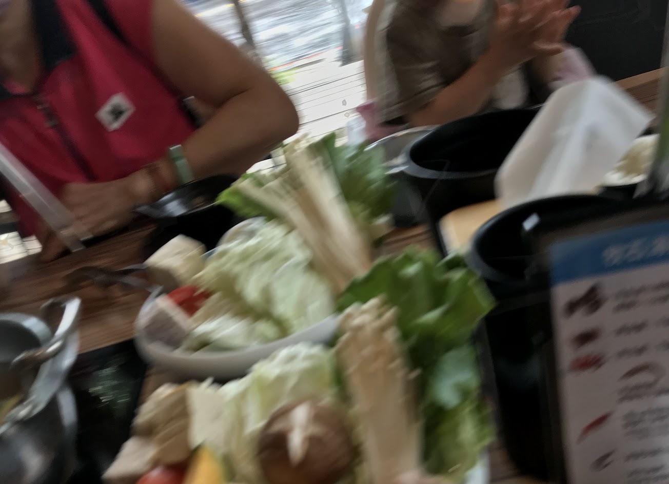 1. 室內濕氣非常重, 窗面的水珠凝結, 滴落, 再凝結. 上樓時還以為在逛築地市場, 走起路來有種溜冰感 2. 桌面及桌下清潔有待加強, 坐下時桌上有沒擦乾淨的飲料痕, 一聞是雪碧, 腳邊有前桌客人吃完的蛤蜊殼, 希望是極少數個案 3. 上菜的順序很奇妙, 湯底 -> 海鮮 -> 肉 -> 招待的蛤蜊 -> 菜盤, 不知道是不是內部溝通疏失, 等了50分左右菜盤才送上, 那些海鮮跟肉都常溫熟成了 4. 海鮮非常新鮮, 蝦子衣服一脫就掉, 擺盤非常漂亮, 整體食物非常美味, 整體CP值相當高