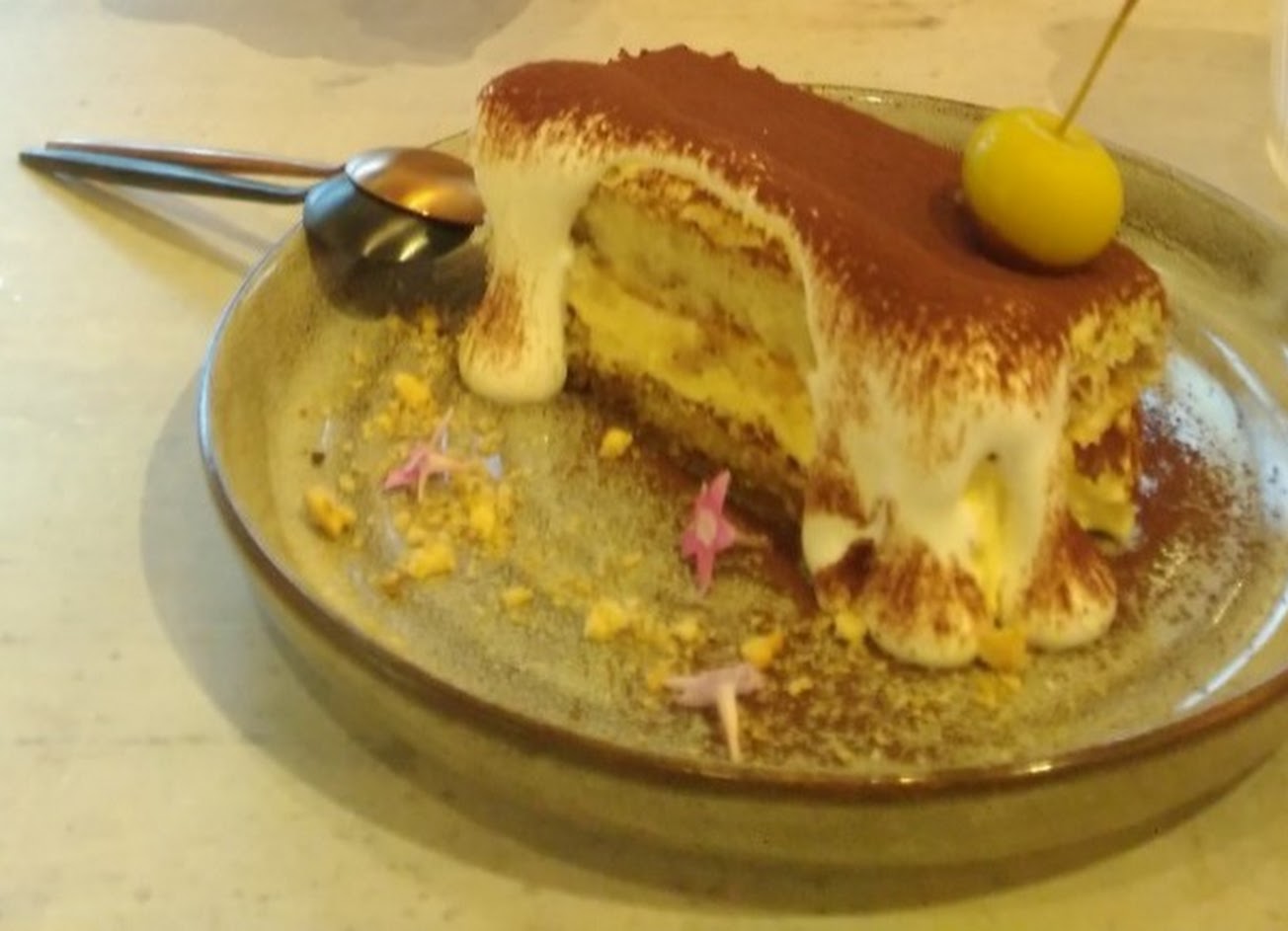 提拉米蘇的奶油容易膩,中間是海綿蛋糕沒有手指餅乾,沒什麼酒味,巧克力粉微苦,上面的柳橙片非常硬,不確定只是裝飾還是能食用的。