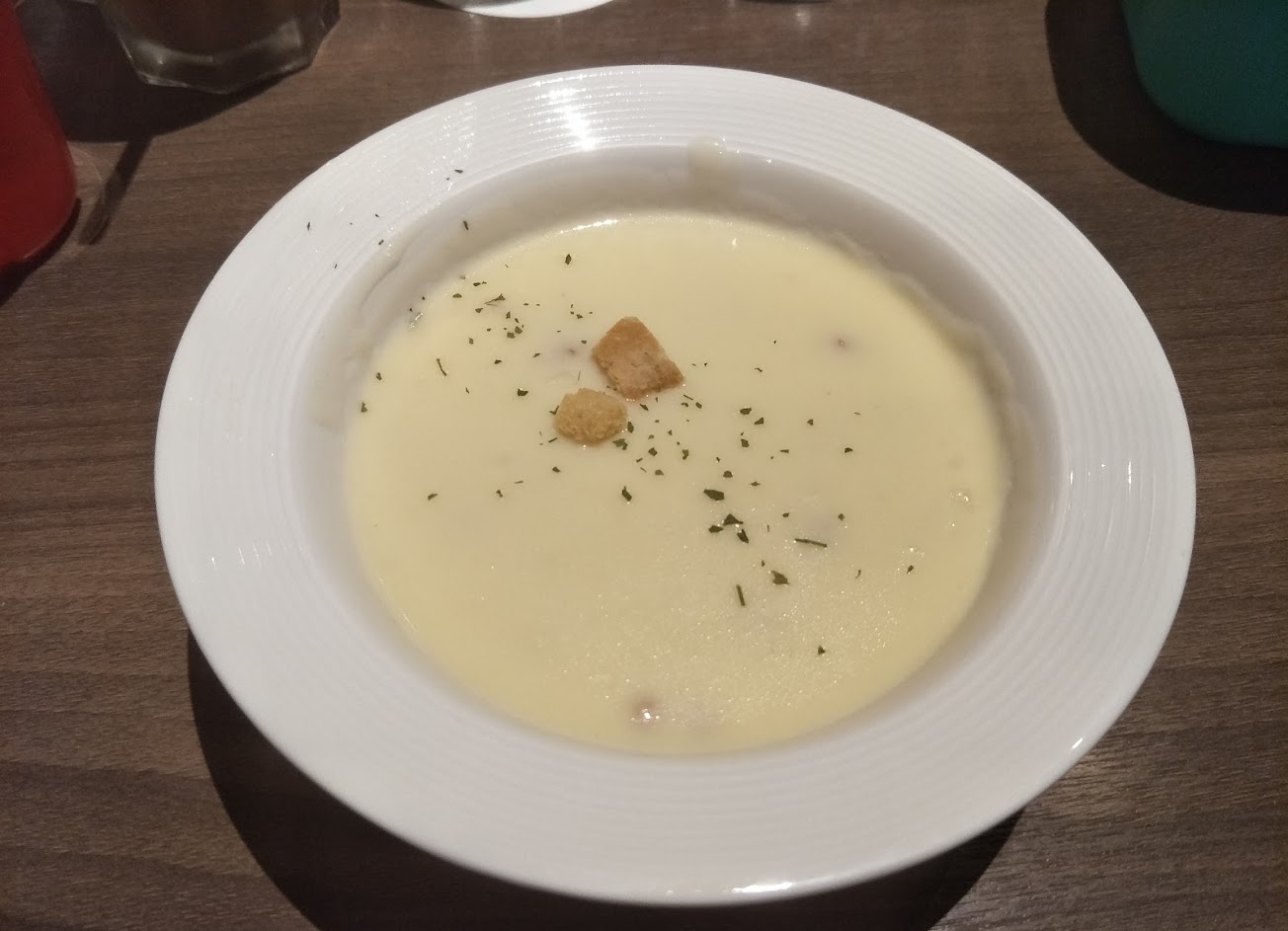 飲料部分平平,整體來說,份量大,氣氛好,口感上其實一開始吃都覺得很好吃,吃到最後才有點膩,然後整趟吃下來服務生至少來服務我們10次,沒叫他們也不知道為什麼一直來?,服務是真的很好啦,然後上菜速度要加強,餐前主廚濃湯,真的很香很好喝,會為了主廚濃湯再來?