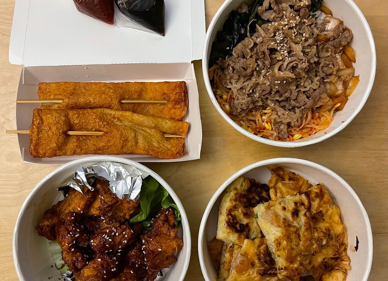 烤牛肉飯還不錯; 韓式炸雞起士及水源醬口味,醬料味並無法蓋掉炸雞本身醃料酒味及薑的味道; 海鮮煎餅的料非常少,少許蟹味棒絲及3-5隻小蝦仁,其餘幾乎都是煎餅糊,CP值很低。 找含意味道還不錯,平常不吃辣的話算蠻辣的,不過也是沒什麼肉跟料…