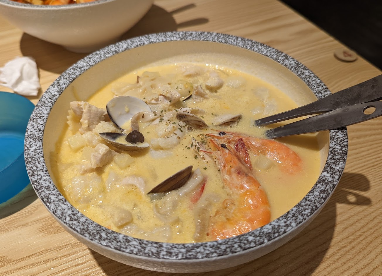 料超級多(蝦子、花枝、蛤蜊、雞肉塊、馬鈴薯塊)湯頭也好喝。