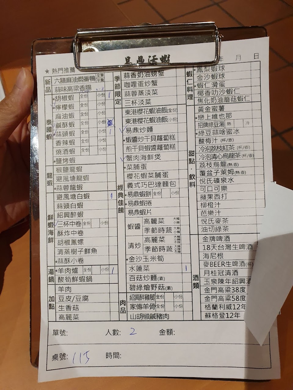 胡椒蝦全份,鹹酥蝦全份,空心菜一份,台啤金牌一瓶共1760.不錯吃
