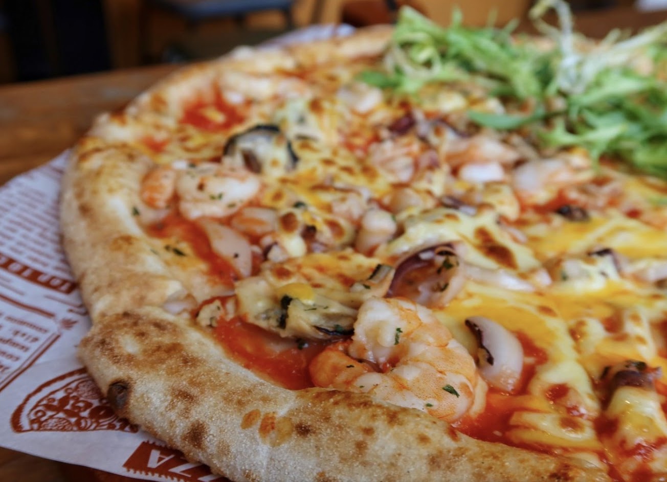 #漁夫海鮮茴香豬肉 雙拼披薩 ??️ 我們點了雙拼一 次嘗到兩種口味 海鮮有淡菜、軟絲、蝦仁 茴香豬肉更灑上芝麻葉點綴 遵循南義大利傳統做法 每日天然發酵製作的手拍麵團 披薩餅皮口幹Q軟有勁 口味清爽不油膩 現點現做的窯烤披薩絕對不能錯過