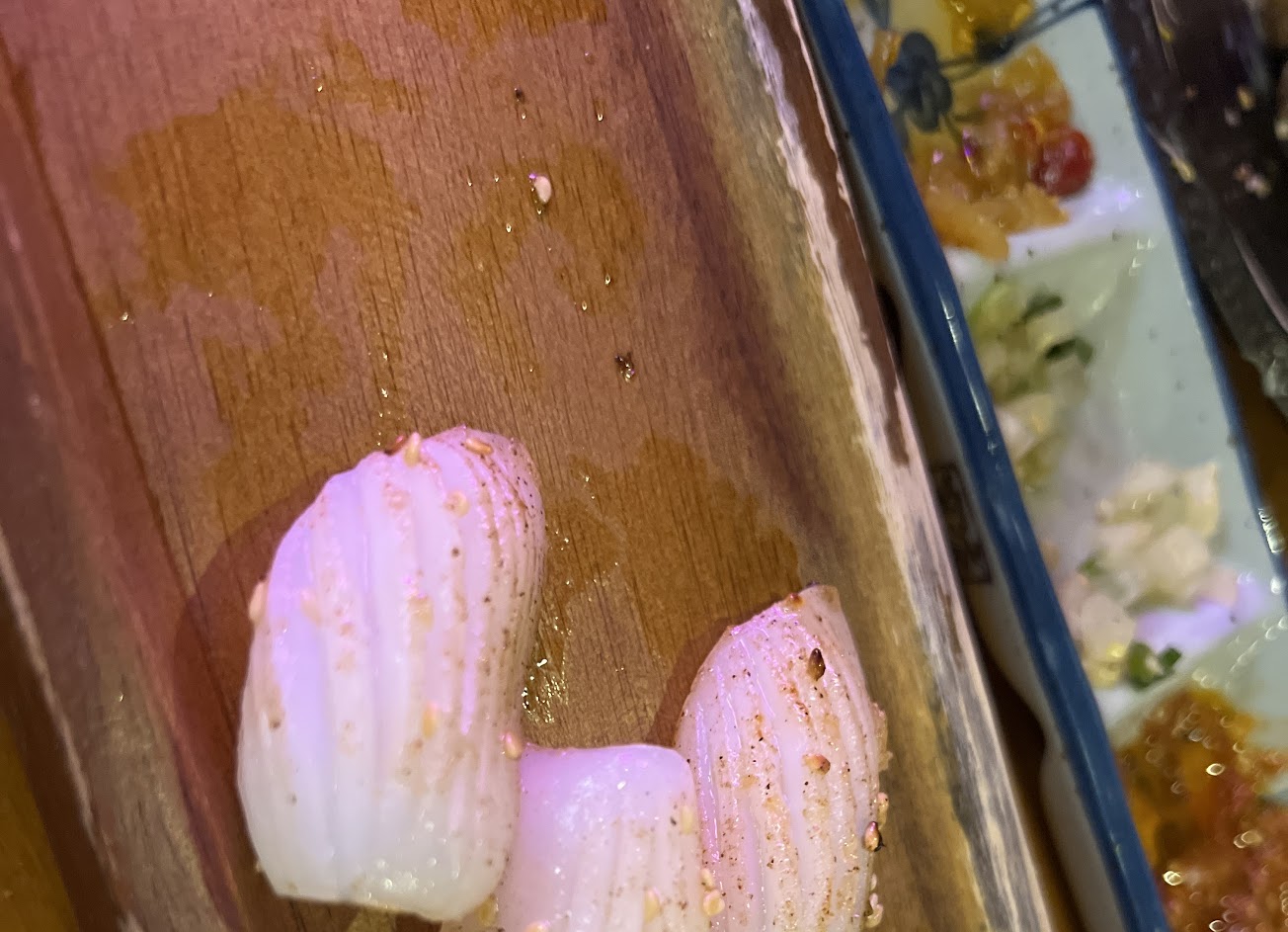 花魚一夜干, 酒蒸蛤蜊, 和牛橫膈膜, 主廚牛肉湯, 伊比利豬肋條, 日本a5 和牛, 澳洲和牛背身, 生食級干貝