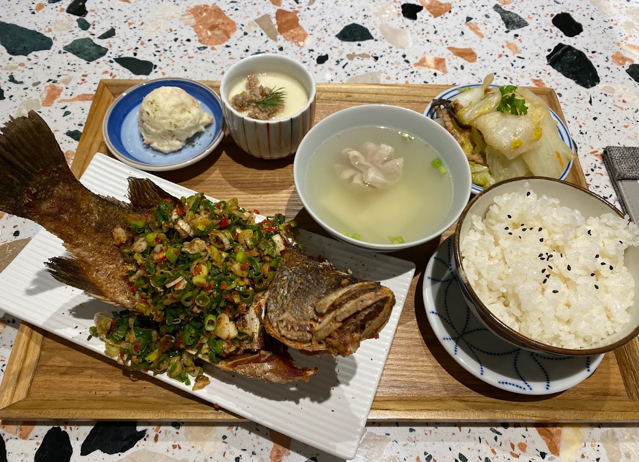 套餐包含主菜、米飯(可免費續)、白蘿蔔配菜、毛豆小菜、蒸蛋、熱湯。 空間寬敞明亮,米飯略顯乾硬不好消化,花雕酒香三杯雞主菜的花雕酒味濃郁,川味麻婆瘋魚片的裹粉太厚,但是醬汁是不錯的。
